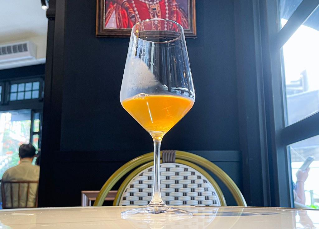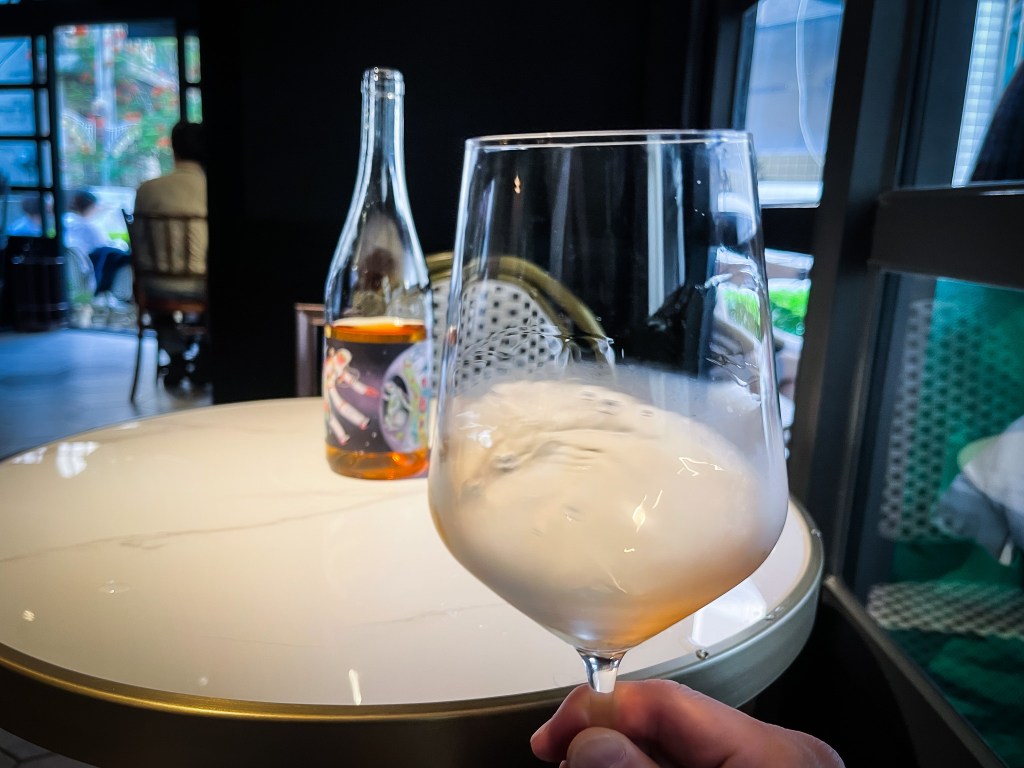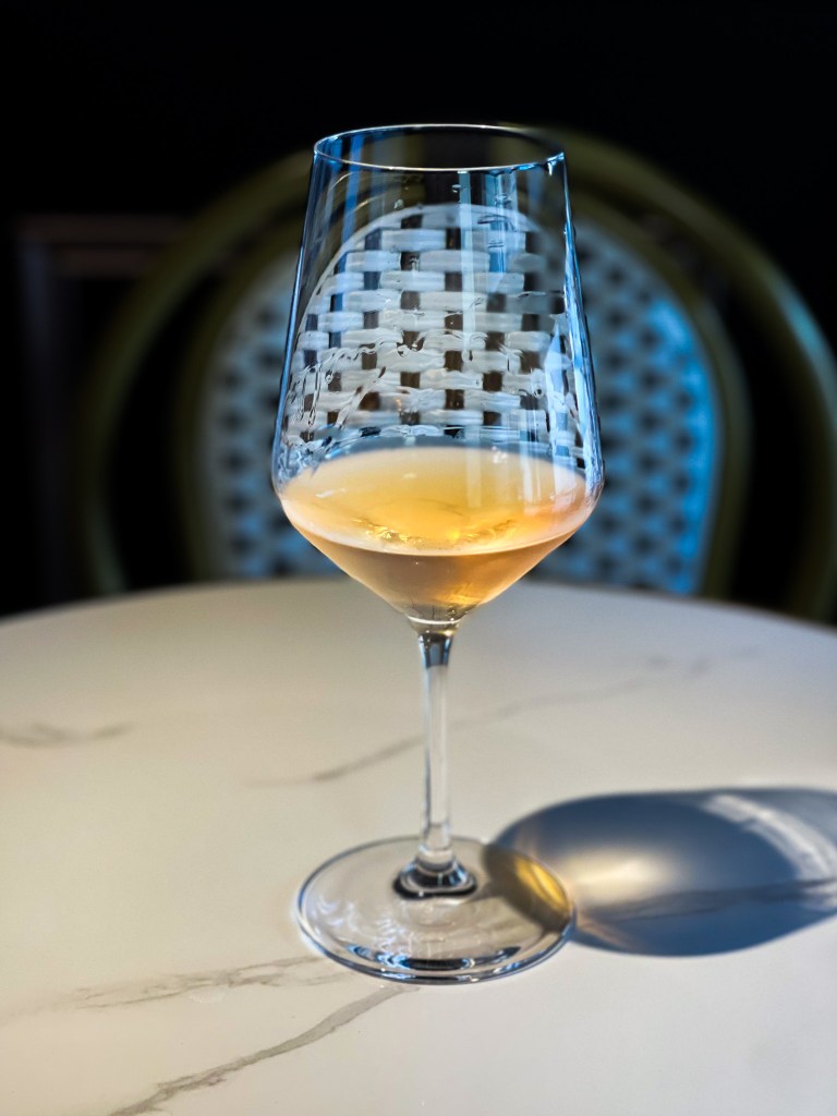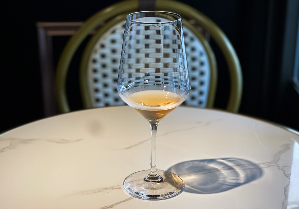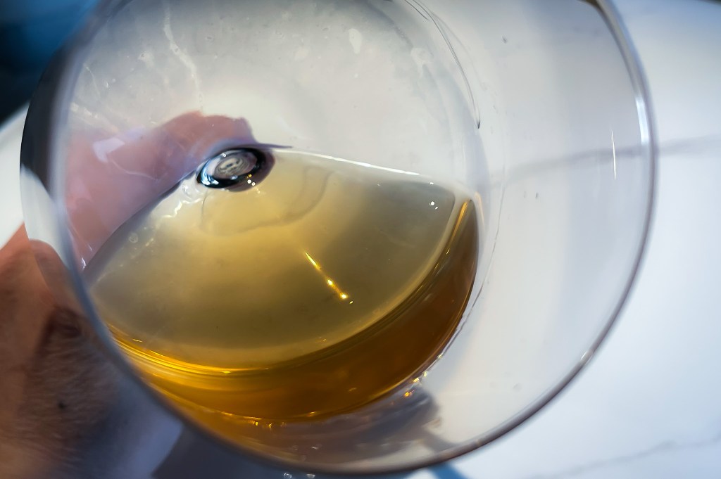 我搖晃酒杯,酒腿緩緩而流,酒液純淨,逐漸顯現橘酒個性。