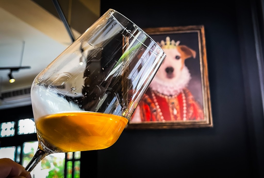 由於是橘酒,酒侍準備了冰桶,俐落了開啟,然後倒了一杯色調如琥珀的Slovenia Amber Wine。圖然絕德這樣的情境很享受,又在這支如穿著太陽王衣服的貓兒圖像前。