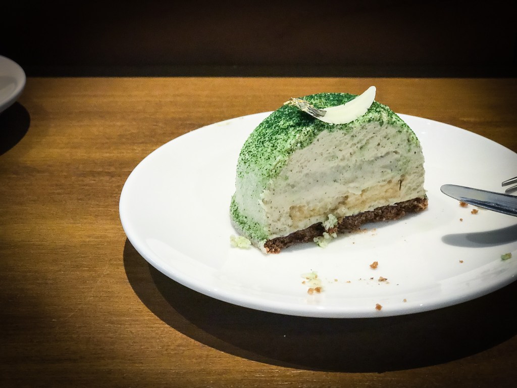 這塊圓弧形的甜點,頂上落了一片牛奶巧克力葉片,點綴如抹茶之綠,所以外型引起我興趣。這款是以臺灣烏龍茶餡搭配蛋糕為主題。