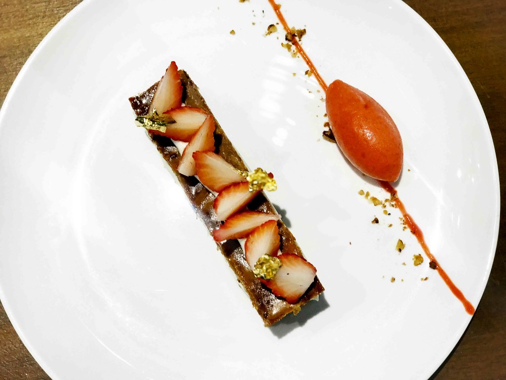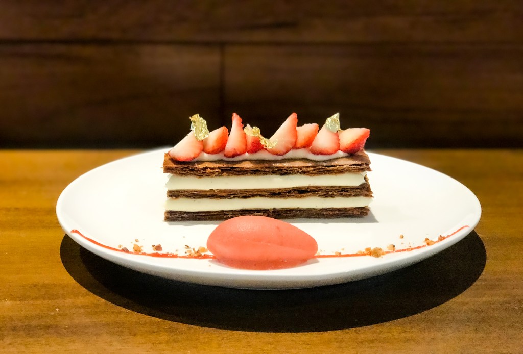 對的,這是最後一道點心千層,而「草莓酥酥」就是千層派。以甜蜜清涼草莓雪酪,並帶著草莓的馥郁滋味作為配角。