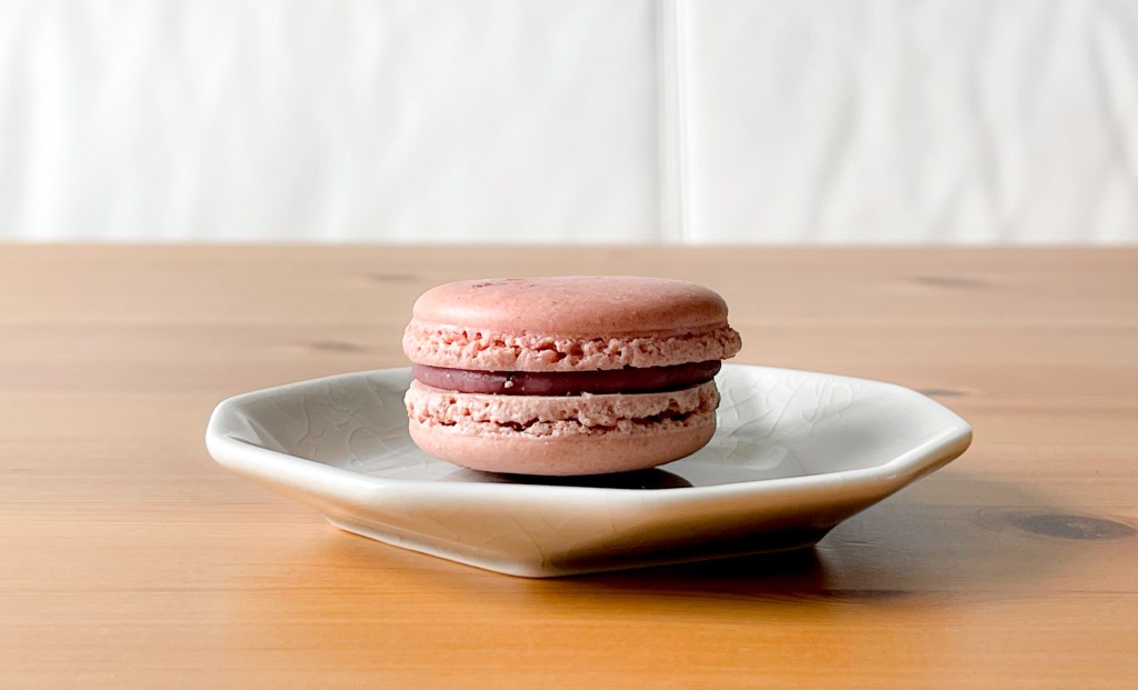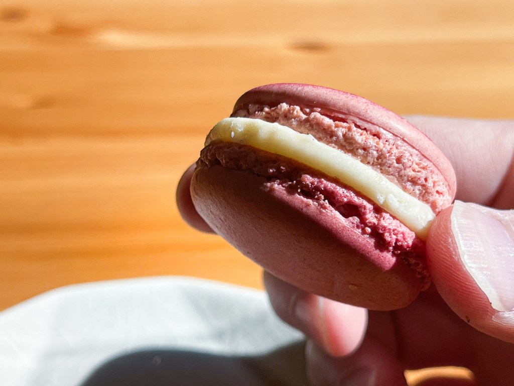 咬下,果然酥香好吃,餅殼酥軟的塌陷,滋味細緻綿密,涼爽清香的覆盆子酸甜,加上隱約的酥香烘烤味,尤其是咬下不是硬殼如杏仁糖,略有空氣感的口感,是讓我最喜歡的地方,就想壽司醋飯有空隙一般才美味一樣。