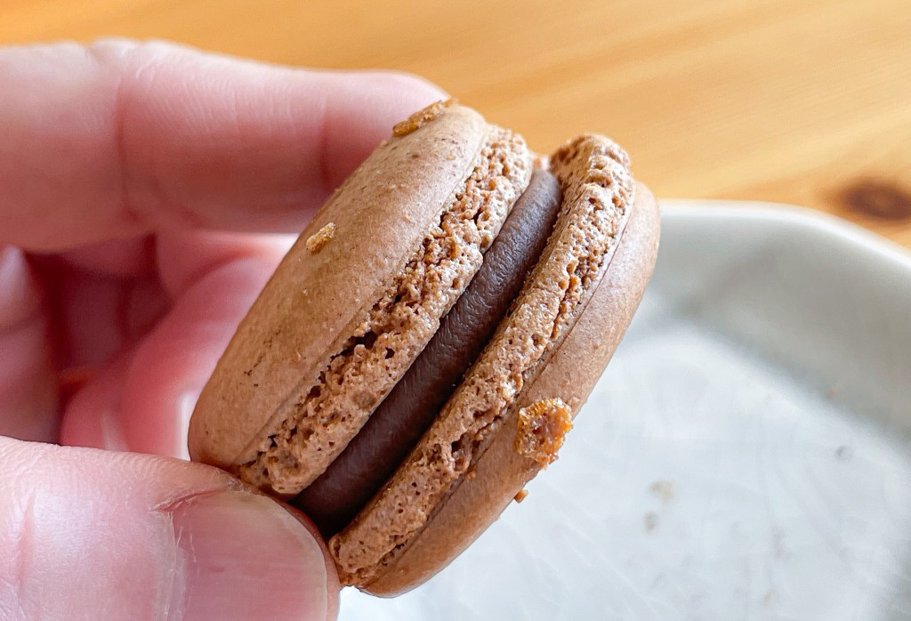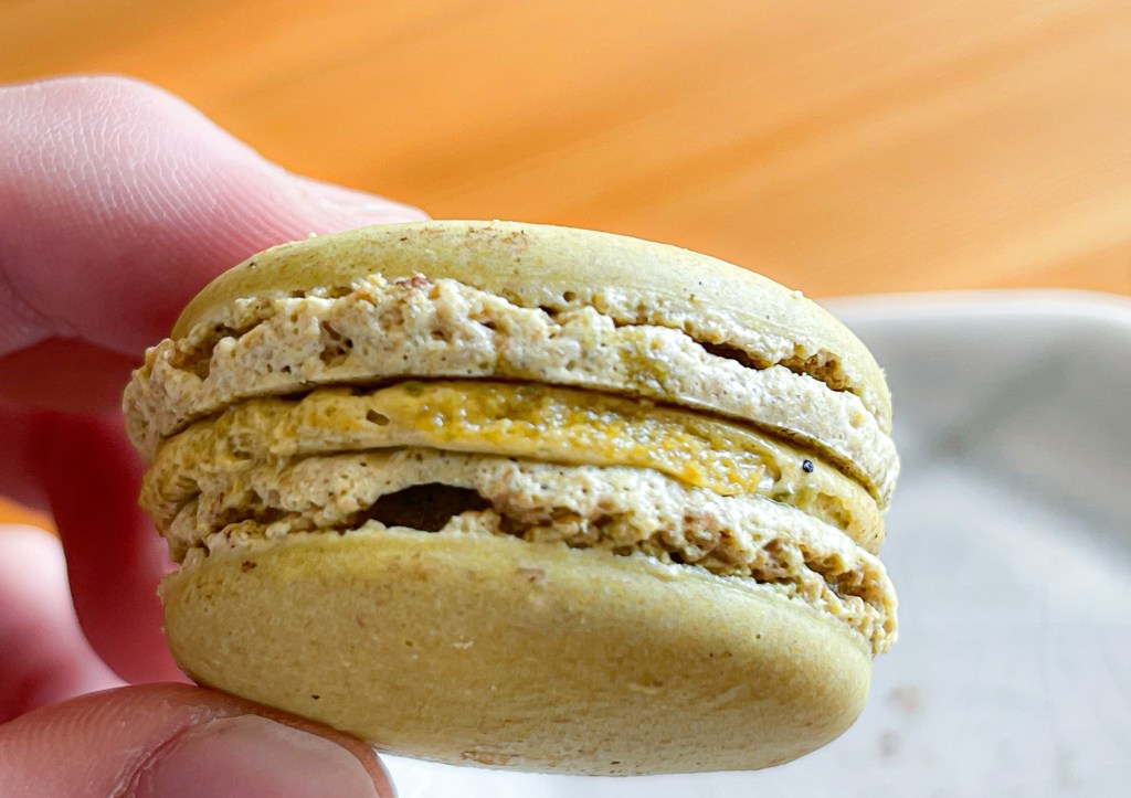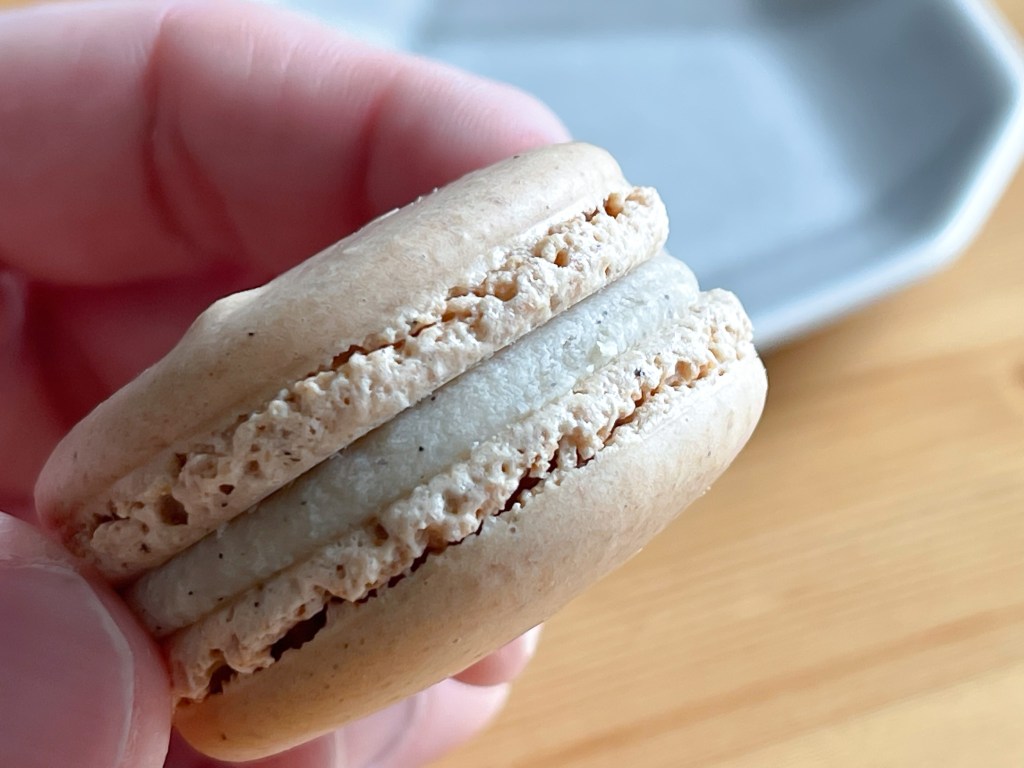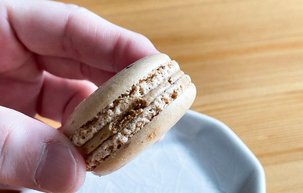 咬下後,雖然感受餅殼似乎不那麼柔軟感,比較偏向糖霜滋味,所幸厲害的馬卡龍不會硬如石頭,因此口感還行,但是焦糖滋味是緩緩凸顯的。
