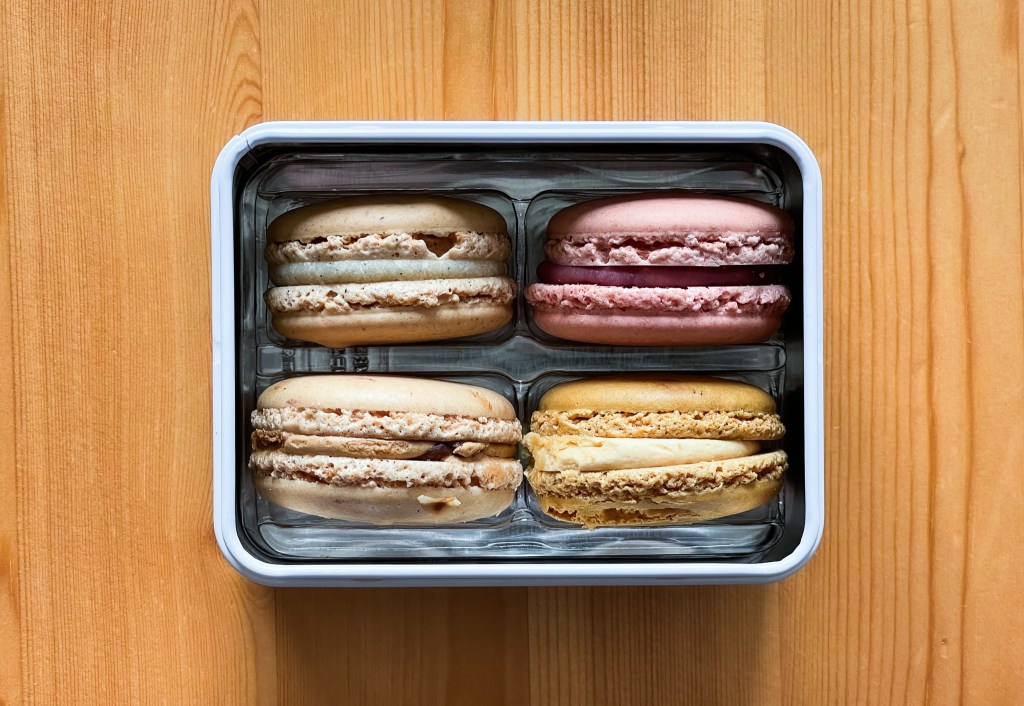 我發現鐵盒裝的好處以及盒內的貼心設置,不用擔心馬卡龍黏在一塊或是太快軟爛,但是回到家記得要冷藏。