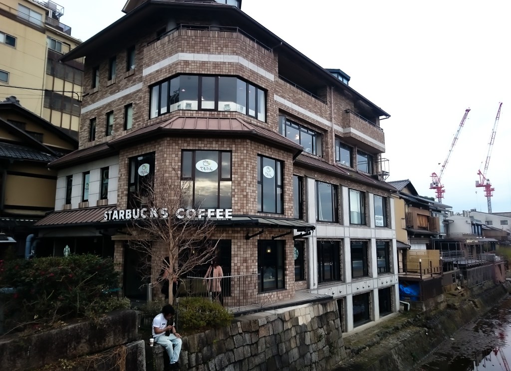 第二個,當然會來鴨川旁的星巴克,但事實上我覺得他是有一個很棒的觀賞鴨川的景色,尤其在夏天,這裡還會架起鷹架,變成戶外的延伸空間,稱之為「涼床」,這得等夏天才看得到。