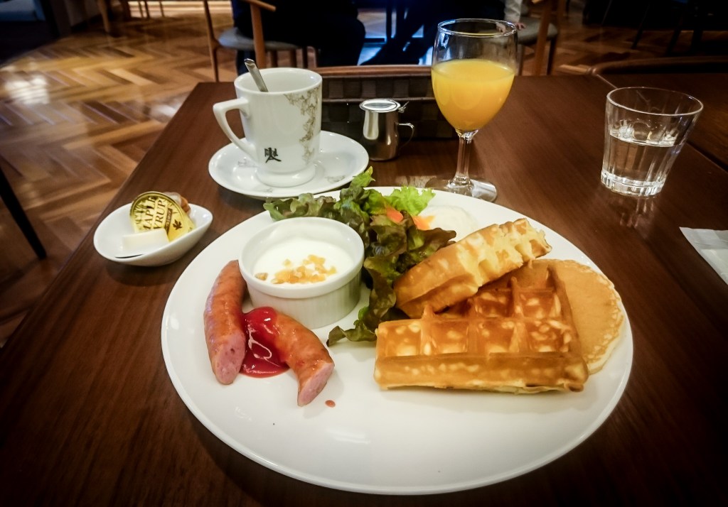 在早上跑完步後,我來到餐廳附設的咖啡館用餐,我點了一份鬆餅套餐作為這天的..算是Brunch了,因為剛剛跑完步在鴨川旁的星巴克喝一杯咖啡和吃了一份點心。