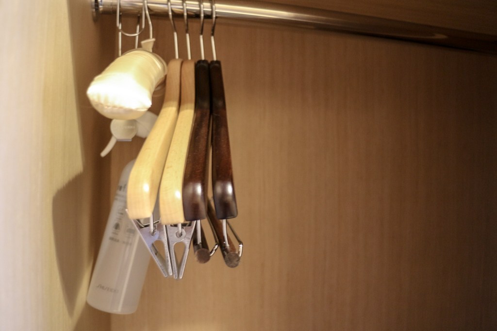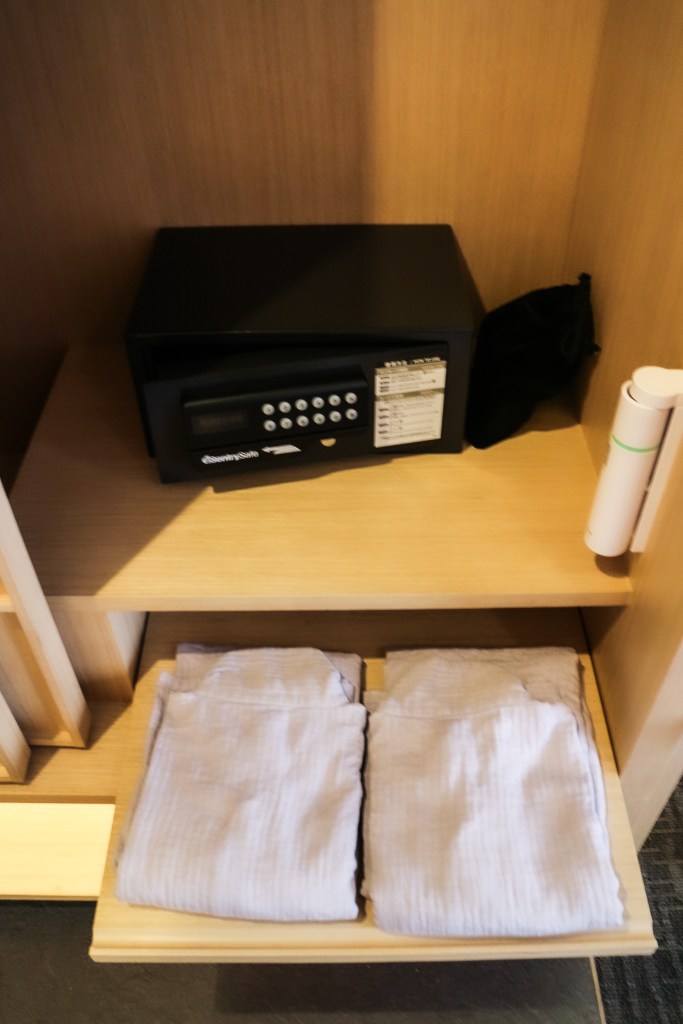 而前進一點的左側則是衣櫃空間,拉開,除了保險箱還有夜間睡衣,運用的還不錯。而我心想這小小的空間還運用得真徹底。