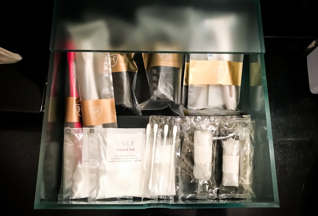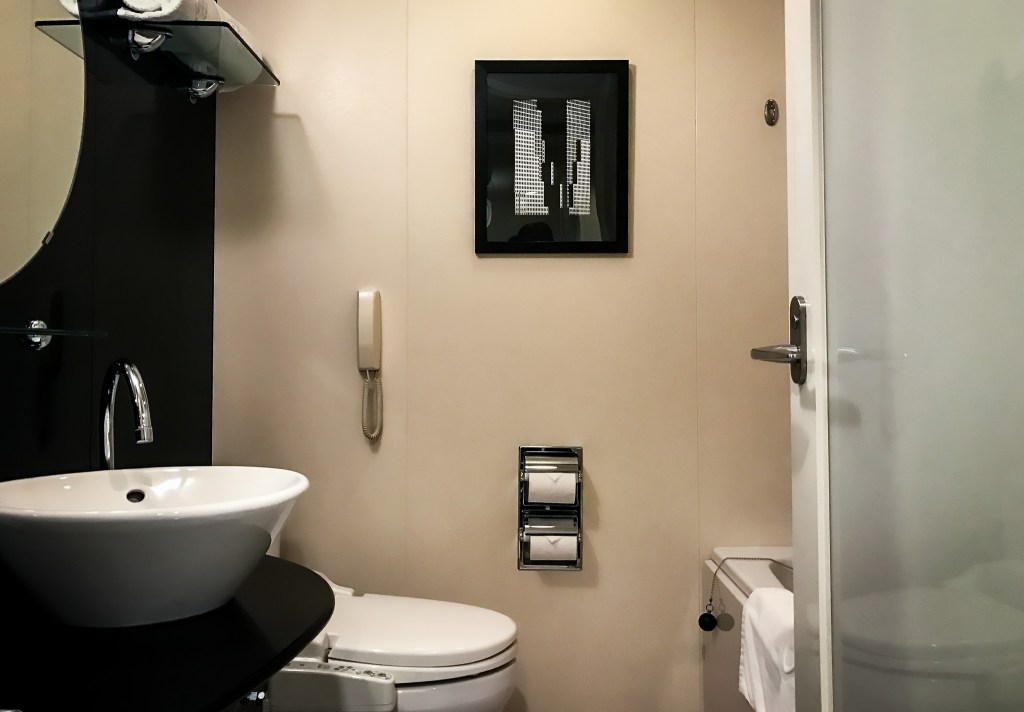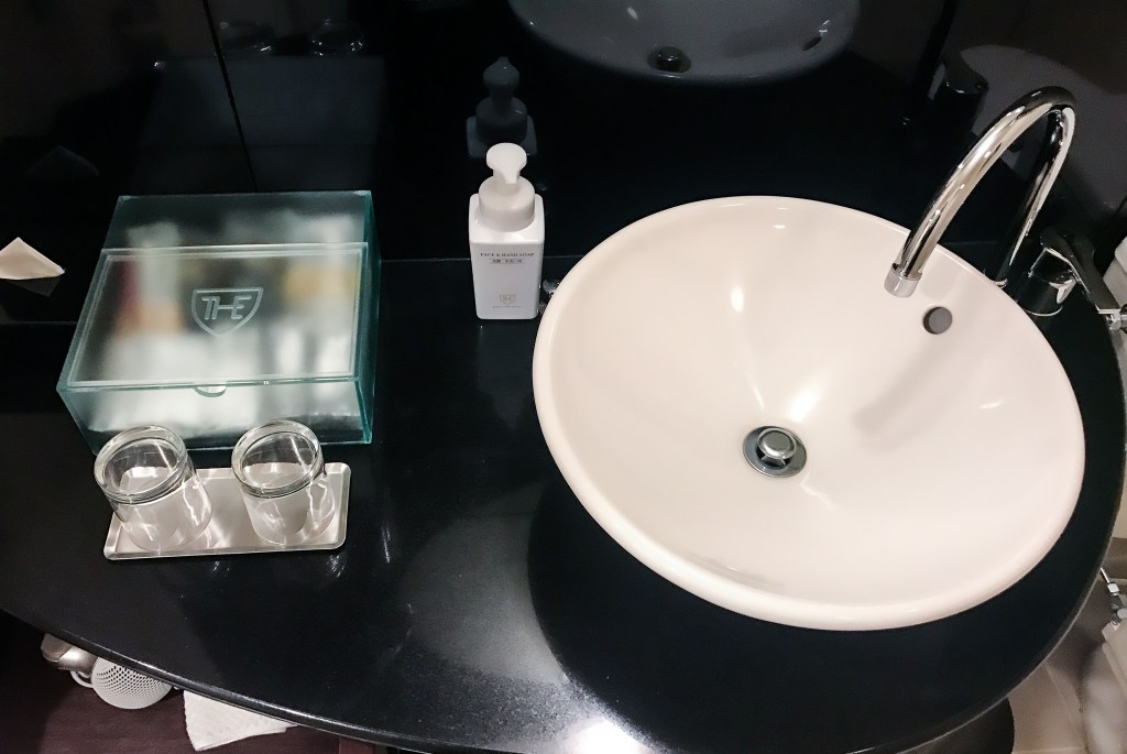 儘管空間小,洗手台的設計也時尚不讓我覺得有違和感,此外也洗手乳,漱口杯以及該有的吹風機等等。