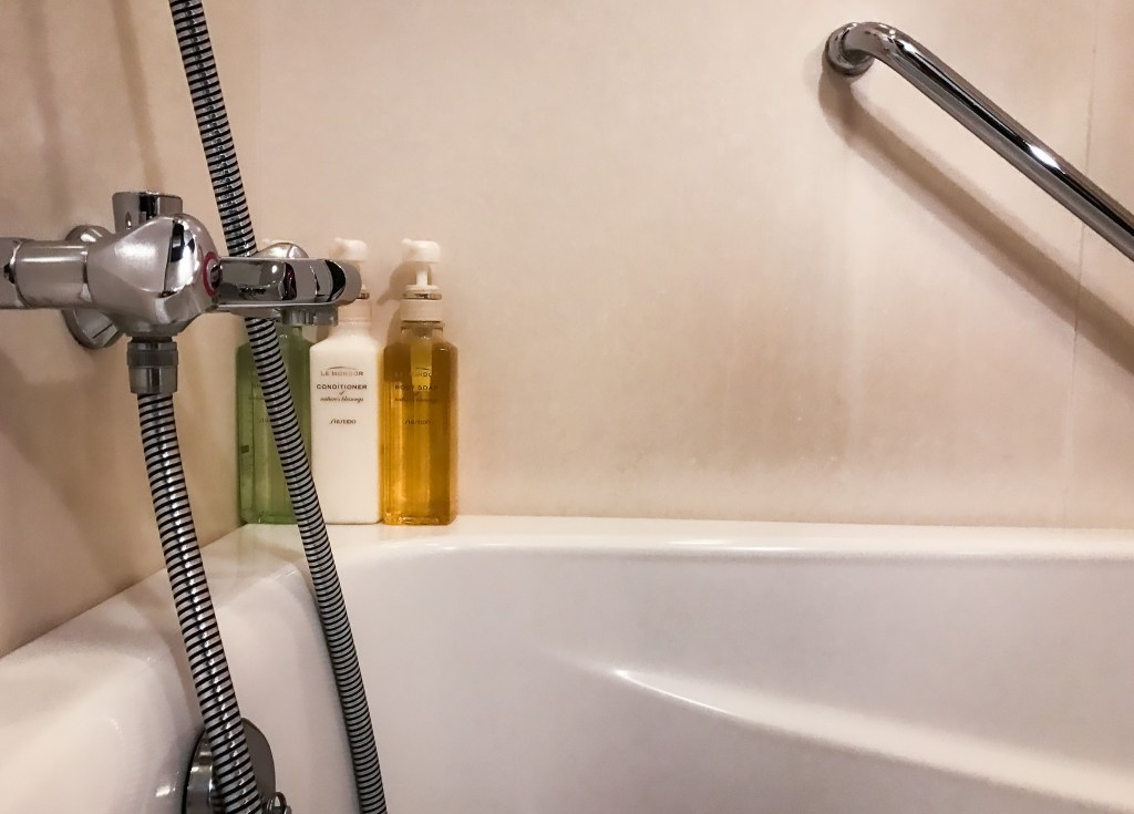 進門後左手邊是浴室,我覺得日本飯店很有貼心的是,就算浴廁空間再如此的窄,該有的不遺漏,浴缸門簾就是代表之一。