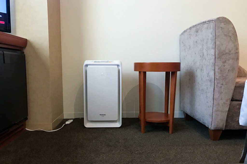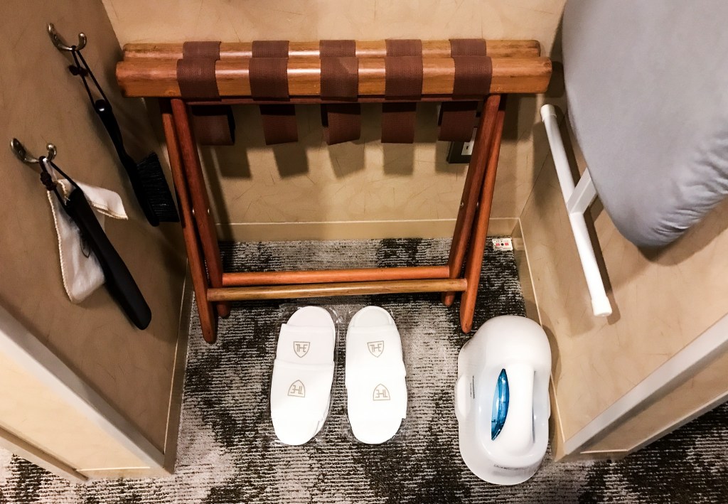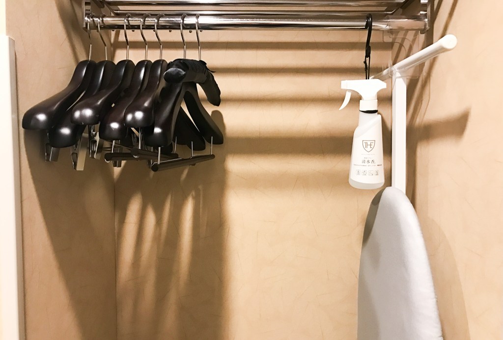 此外,近浴廁邊的凹陷一處就是設計成置物空間,如除臭劑,掛衣架,市內椅還有熨斗與燙板,這對商務人士的需求是相當足夠豐富的。對了,除臭劑,日本飯店幾乎都有,這是很棒的服務。