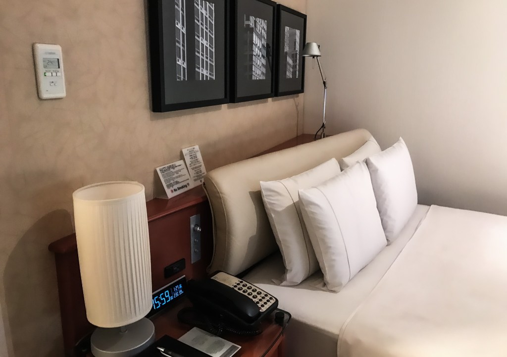 床的桌邊則是控制燈的中控,電話、鬧鐘以及小檯燈等等,儘管如此,房裡也不失一種藝術與雅致的設計,例如幾幅附近大樓的攝影作品就能襯托這樣的風情。