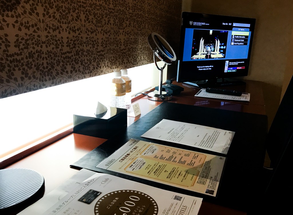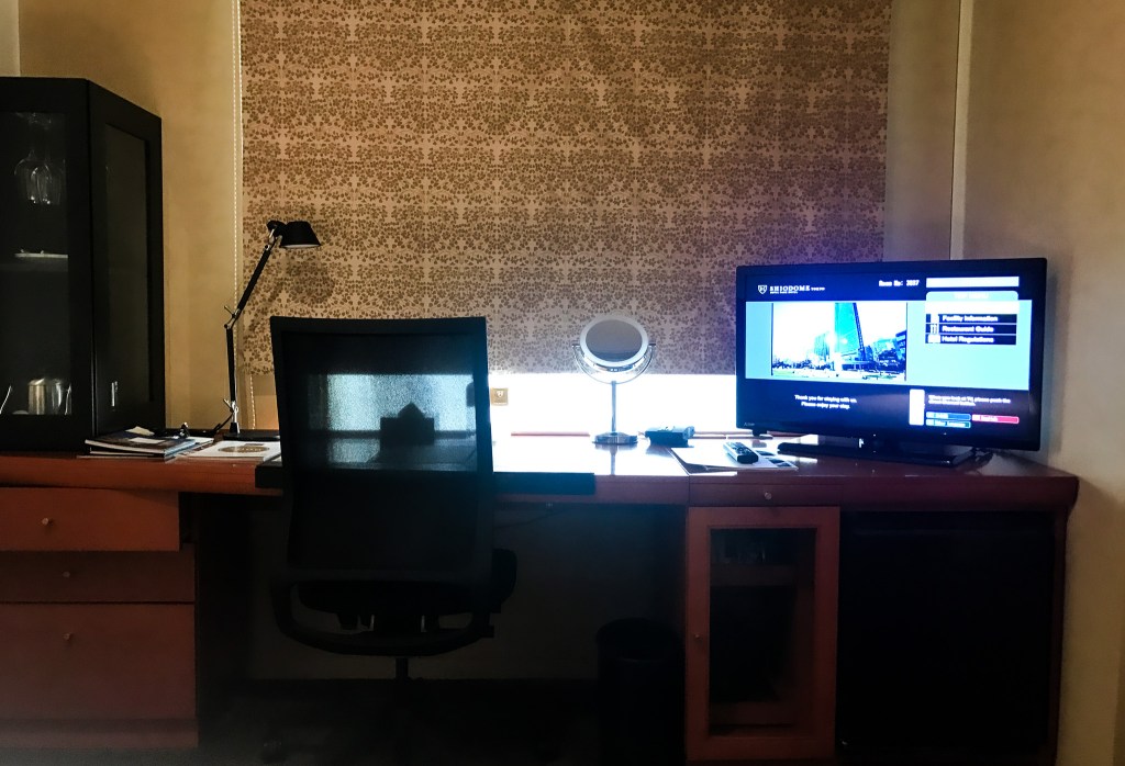 此外,桌上還有入住飯店的盥洗用具,面紙,桌燈,整容鏡以及至於下方櫃子裡的冰箱等等。