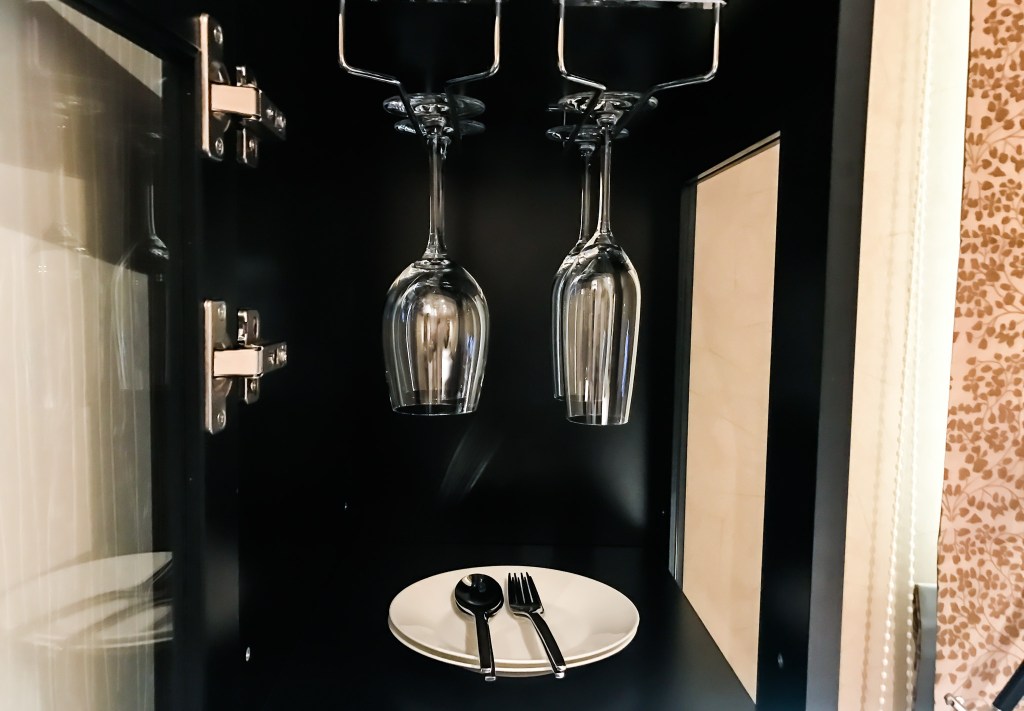 電視平台的桌子,然後有一個酒櫃Mini Bar,除了有紅酒杯外,也有些適用的器具,這點我相當愛。