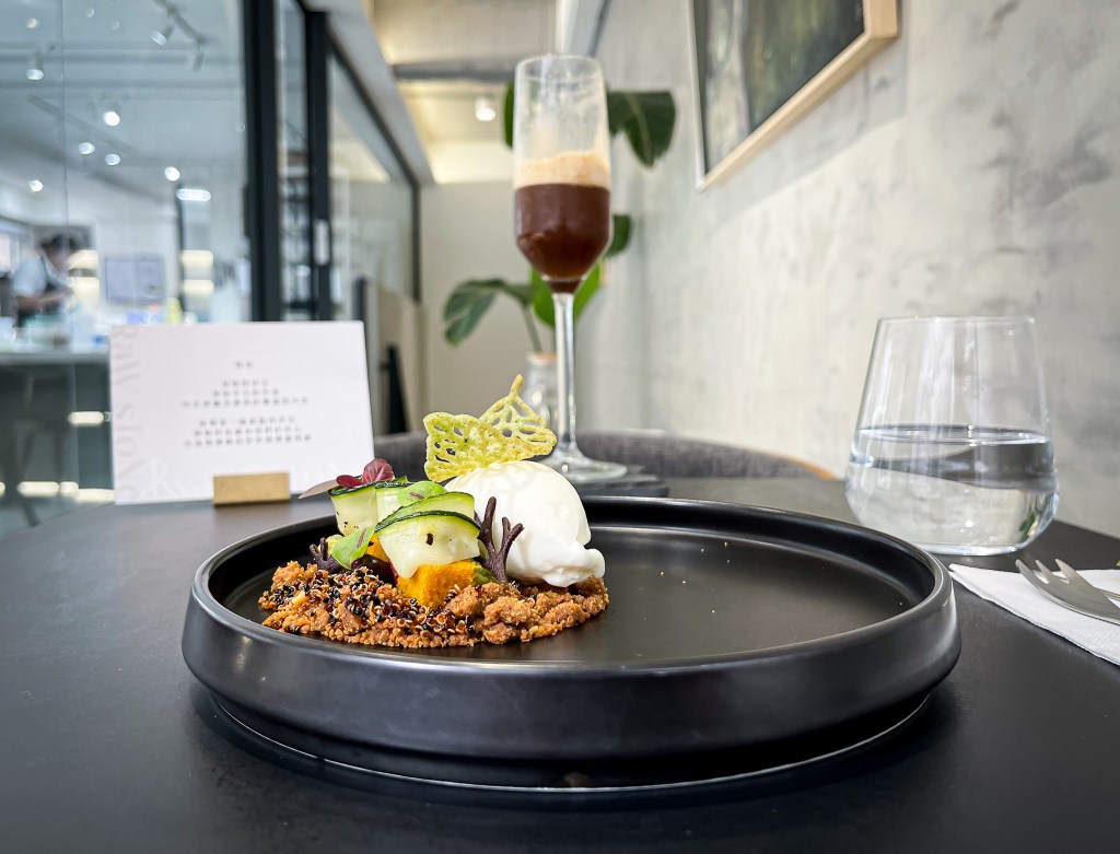 這道甜點是以雪酪是主角?還是襯底藜麥和開心果製成有crispy感的碎餅乾為主角?還是那櫛瓜、以及胡蘿蔔蛋糕帶點非甜概念的食物呢?吃下後,哇,我突然有一個感想,就是吃甜點料理最不一樣的就是就是意念、食材和搭配。這道看起來衝突但吃起來,我很愛。尤其藜麥和開心果喔組合帶著酥香的餅乾味,而且滋味相當美味。