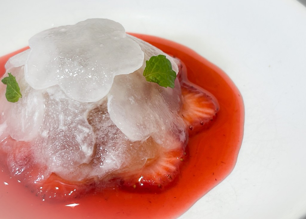 這款是用酒釀醃漬的大根,草莓還有桂花釀的果凍,尤其這美味的糖漿和草莓融合,產生甜蜜可愛的風格。