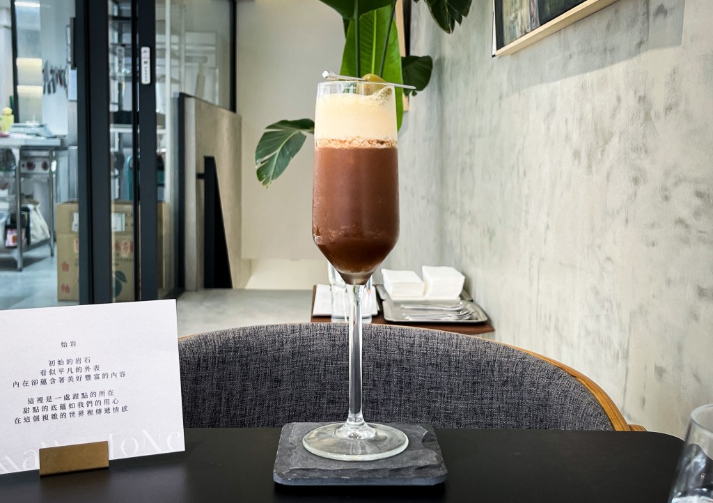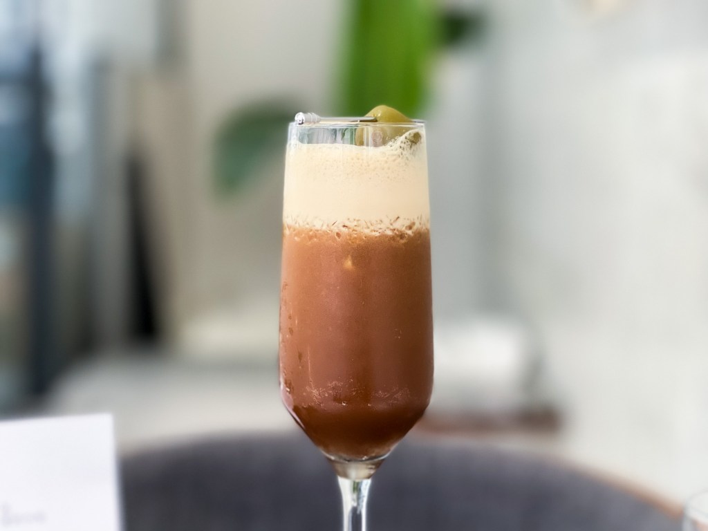 好的,在甜點尚在準時,一杯以香檳杯與一層焦糖咖啡色泡沫,與咖啡色與冰咖啡無異的特調送上了,接過服務人員介紹,它是一杯以梅酒為基底的調酒。