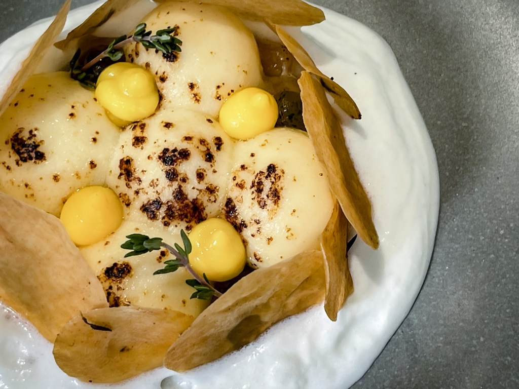 # 西洋梨/青蘋果/起司奶霜/炙燒莫札瑞拉起司/百里香/牛奶/柑橘蛋黃醬/薄荷