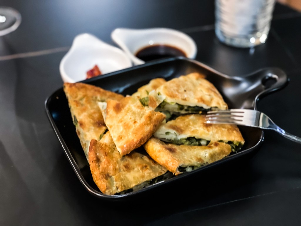 對了,我還有點一份蔥油餅,這塊餅切成數片,但說真的,皮脆香氣足,在晚間邊搭配葡萄酒邊吃,先不說搭或不搭,就是爽快好吃,尤其有辣椒和醬油的陪伴,愉快。