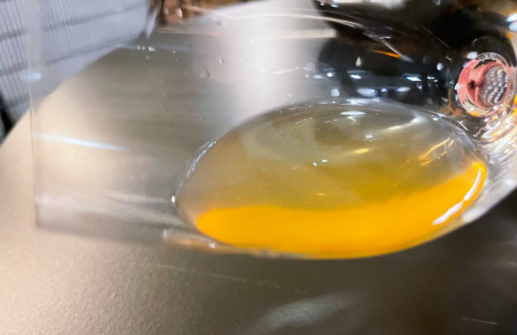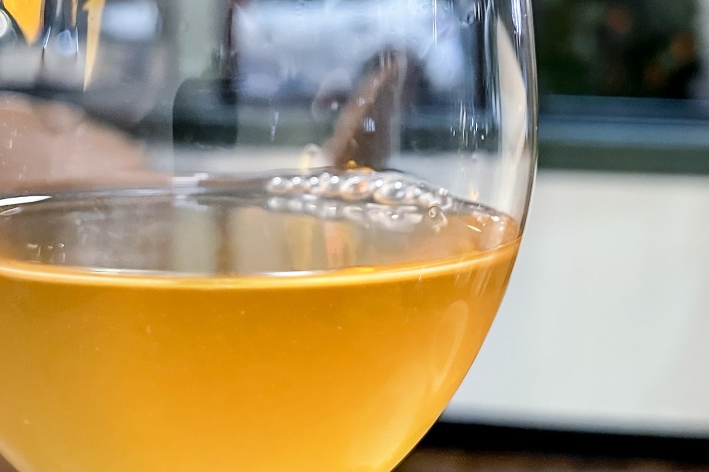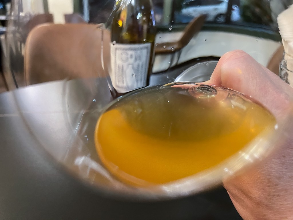 但是我仔細的看一下,有混濁的沉澱,當搖晃酒杯,酒緣俐落而下,攀附杯腹的酒腿光澤俐落而緩緩的墜落在橙黃酒體上,不愧為自然酒,不愧為橘酒啊。
