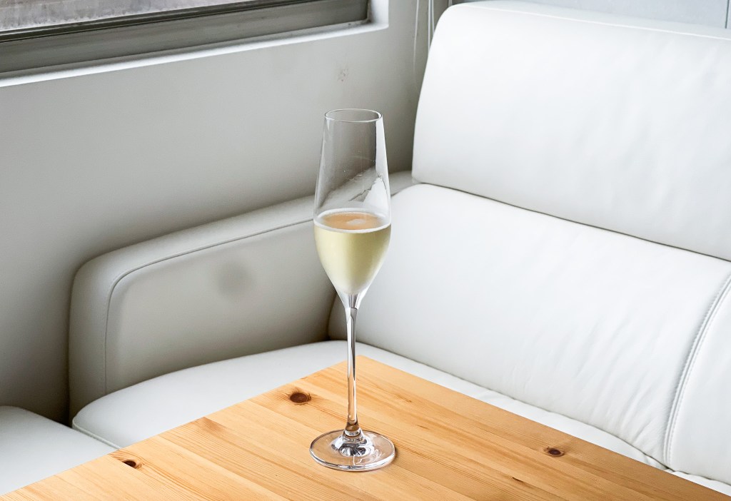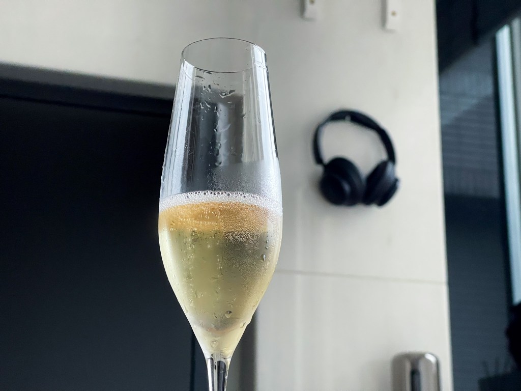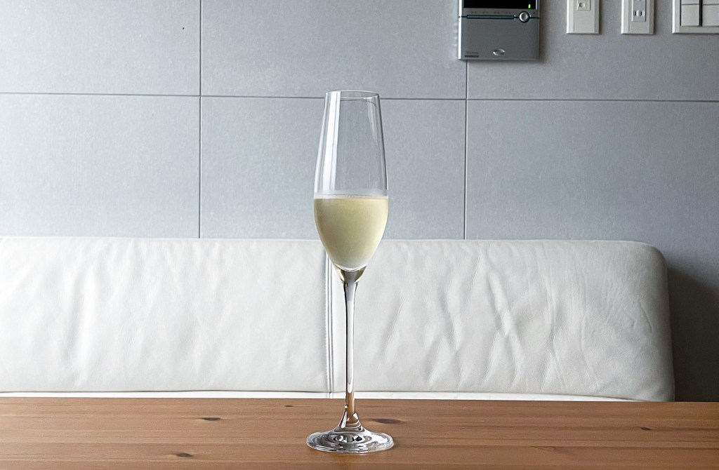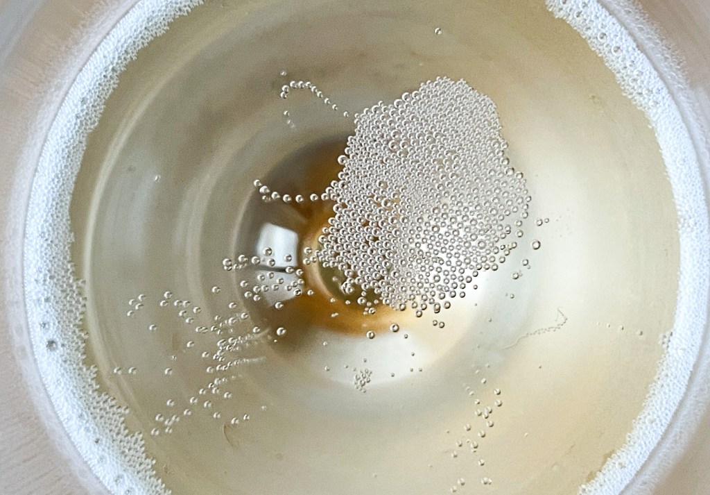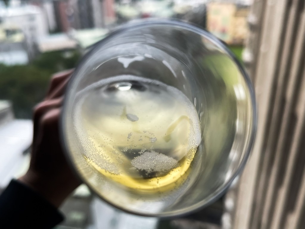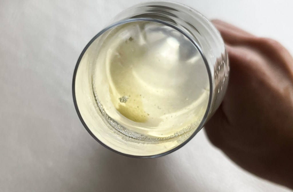 其氣泡仍然輕快悠然,傾斜酒杯回歸直立,只見乾淨酒緣緩緩直線俐落流下,而酒面仍然乾淨仍然俐落。