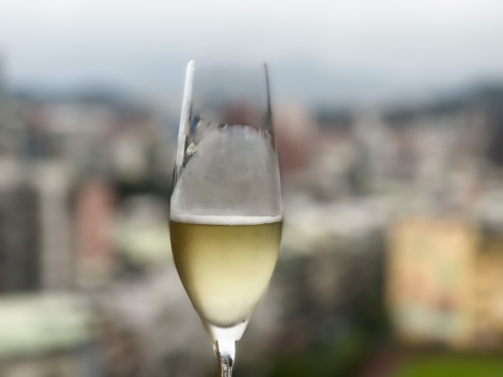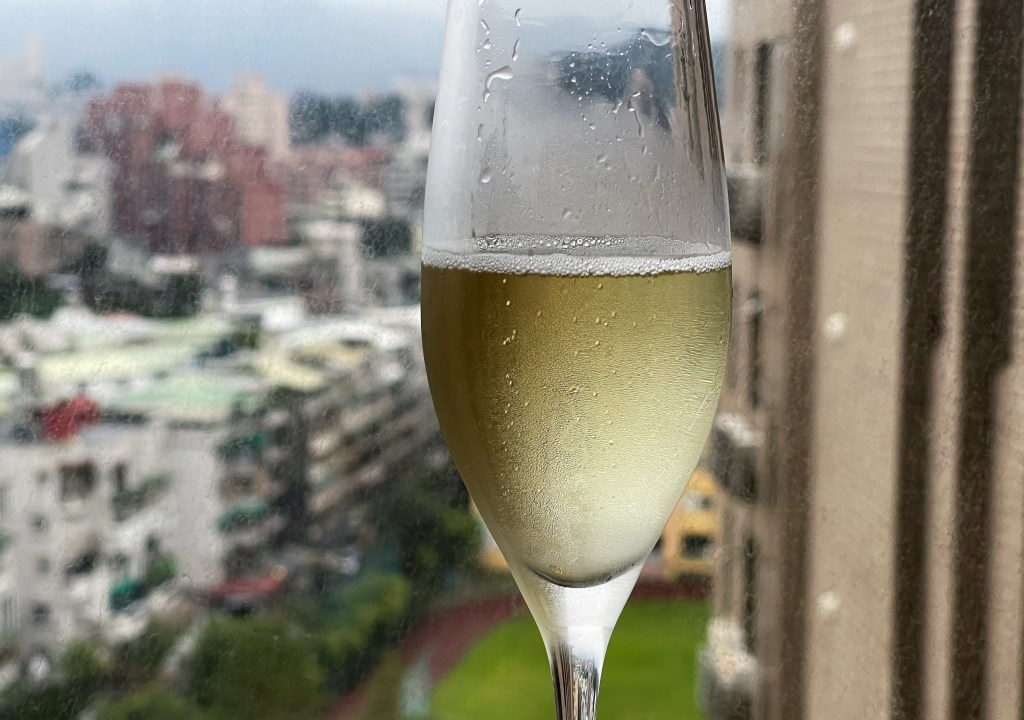 我傾斜酒杯,欣賞這款酒的顏色,氣泡仍活躍上升,泡沫浮漂在酒緣,但我仍能清楚看見透澈乾淨而透明的俐落感的酒體,緊接進入微微的輕銀色與青黃,再一層則逐漸進入了檸檬黃感。