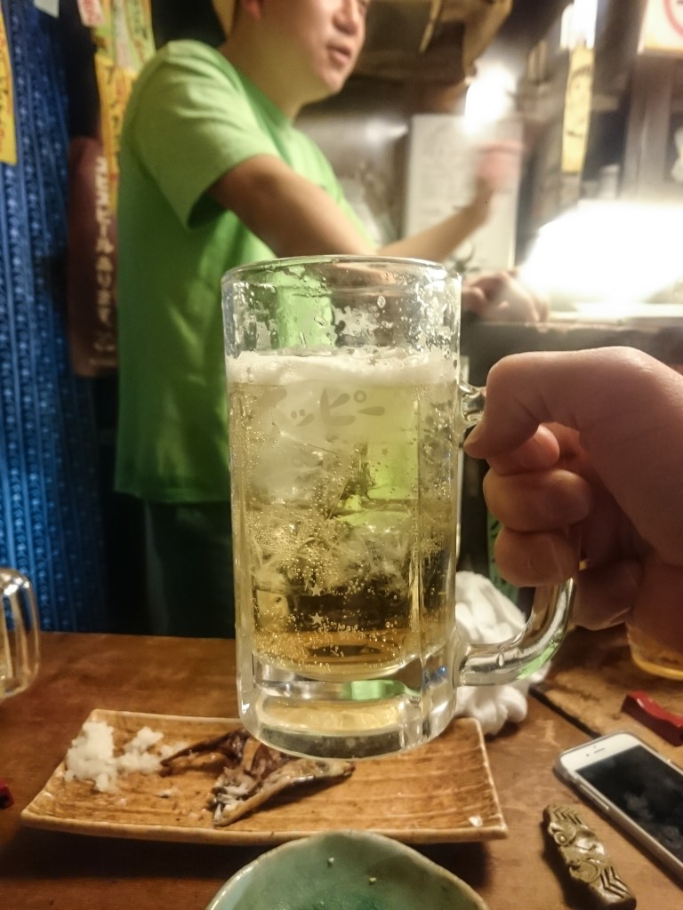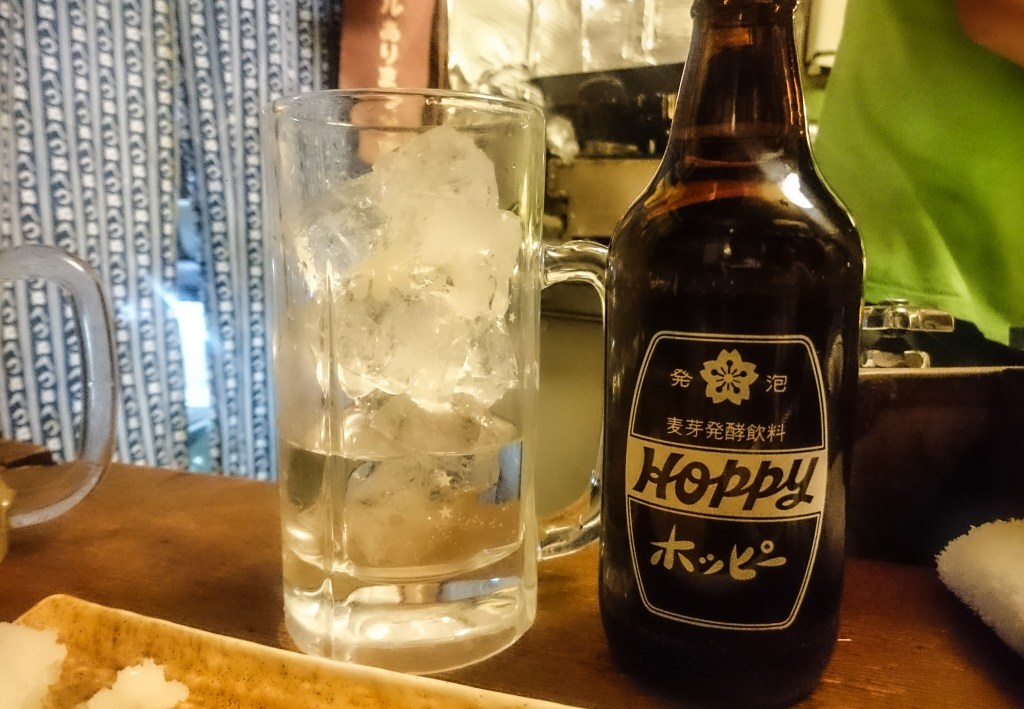 由於看到隔壁日本大哥的喝法,原以為他手上那罐是日本啤酒。結果不是,竟然是一種叫hoppy的氣泡飲,當然那不是拿來直接喝的,小祐老闆拿上了加了冰塊的杯子,裡面有25%酒精的金宮燒酒,再將hoppy倒入,成為一款大殺四方的調味燒酒。