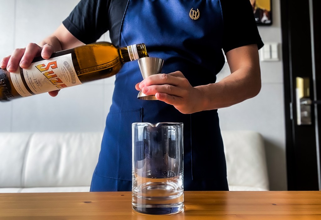 我依序將Gin、Suzz、Lillet…等等依照比例加入高酒杯中,然後取出冰塊攪拌,由於明年是2024年,那麼就來攪拌個24秒,希望這杯改良的酒會相當美好,也同時代表明天開始的生活可以更幸福美滿!!