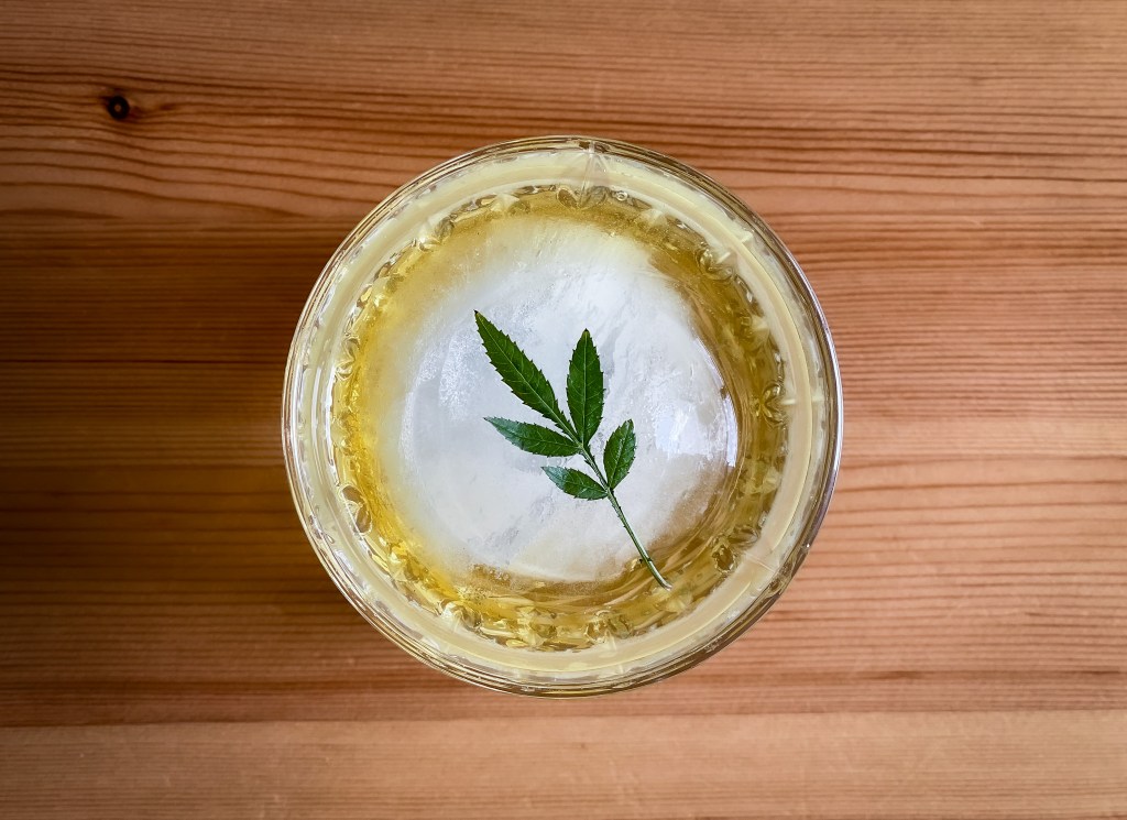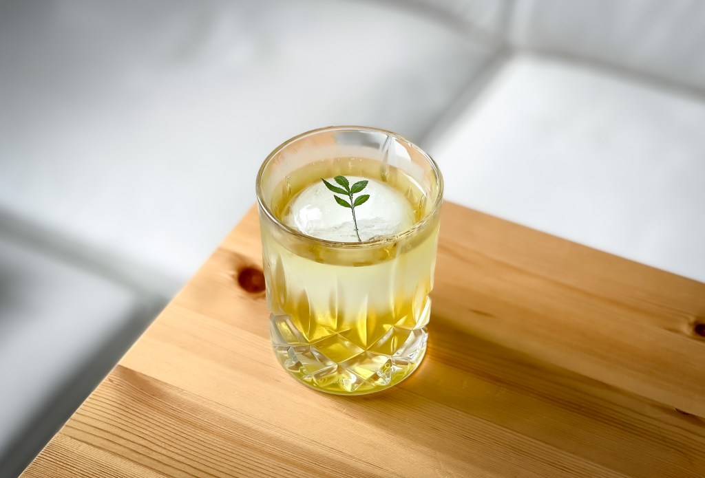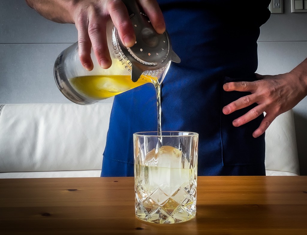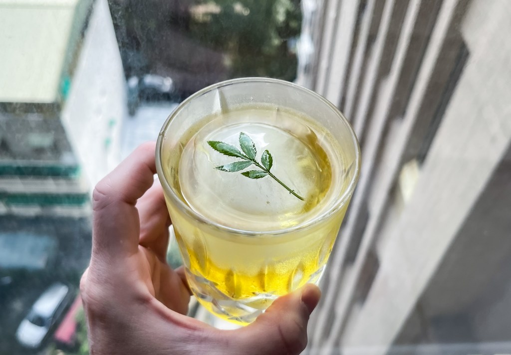 攪拌完成後,我用濾冰器將酒注入加入冰塊的杯子中,最後擠上一點臺灣香橙的皮油,然後摘一片芳香萬壽菊作為裝飾。簡單,清新,作為美好的開始。