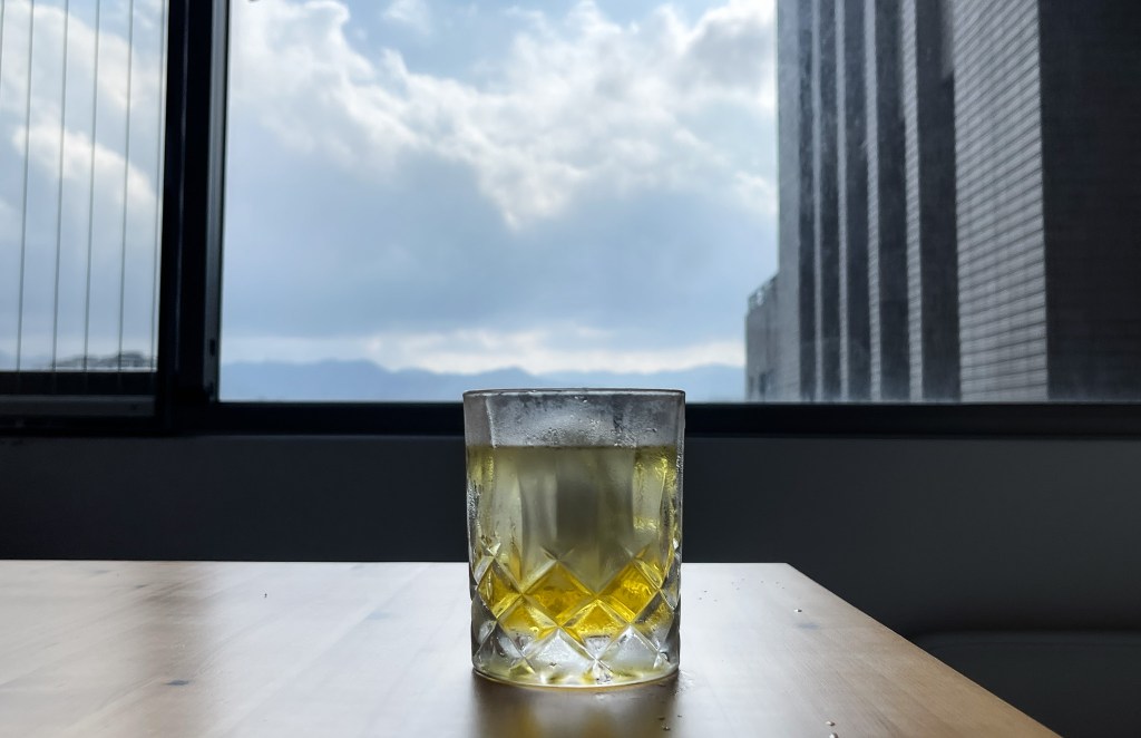 先觀看一下色調,我覺得是非常美麗的金黃色而微微偏鵝黃的層次色彩,由底至高由深至淺,有金黃琥珀到青黃透明,光澤優雅,看來我對這杯調酒深具信心。