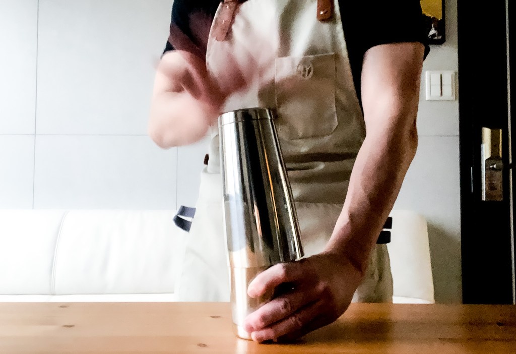 接著,我加入了冰塊,並蓋上Boston Shake然後開始搖盪,同樣的讓冰碎感增加,也讓杯子產生霜凍感。完成之後,準備好一杯Rock杯,加入一顆大冰塊,然後將酒注入杯中,大約在八分滿左右即可。