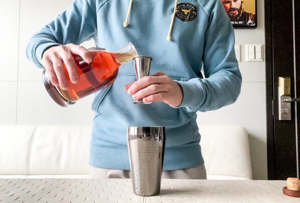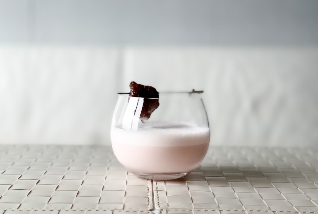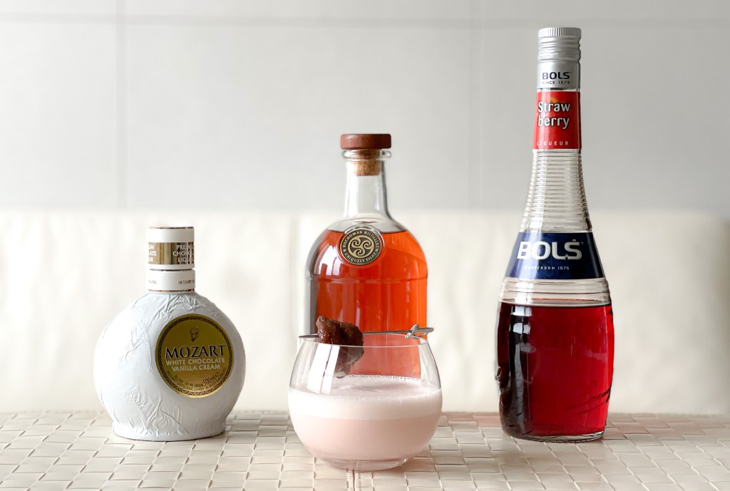 我將自己泡製的草莓威士忌,以及利用酒漬草莓主的草莓糖漿,最後把剩下的草莓再糖漬起來,作為這杯酒的主角,另外還添加了草莓利口酒。