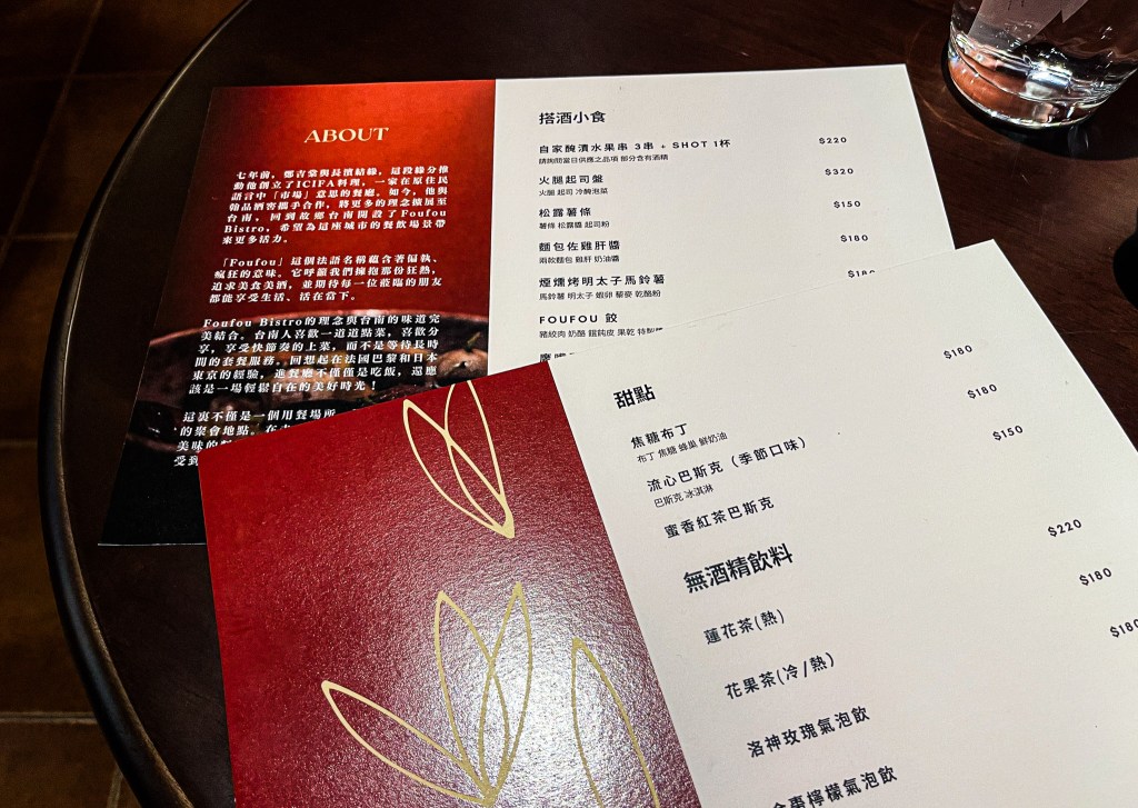 餐廳主廚是鄭吉棠,原來是臺東的創立ICIFA餐廳,如今回到臺南並與翰品酒窖合作,創立一間以法式小酒館並提供豐富葡萄酒的餐廳。Foufou Bistro的理念與臺南人的味道契合,喜歡一道道點菜,喜歡分享,享受快節奏的上菜,因此這裡沒有套餐的服務。
