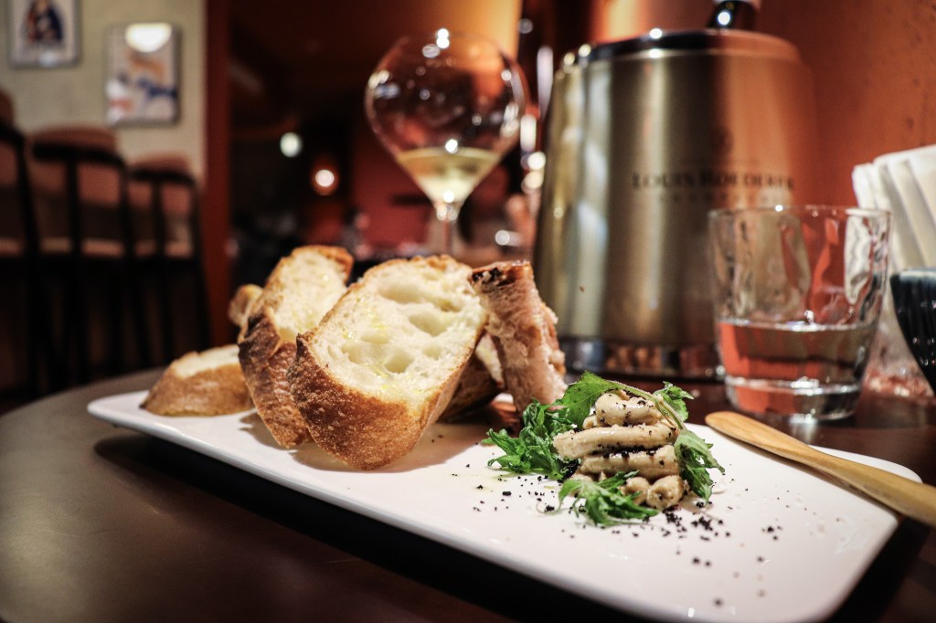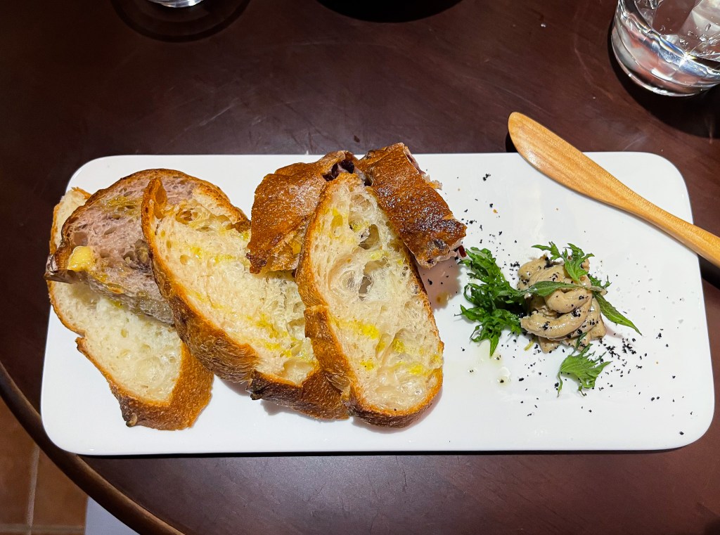 第三道吃完後就飽的食物是「麵包佐雞肝醬」(兩款麵包、雞肝醬)。