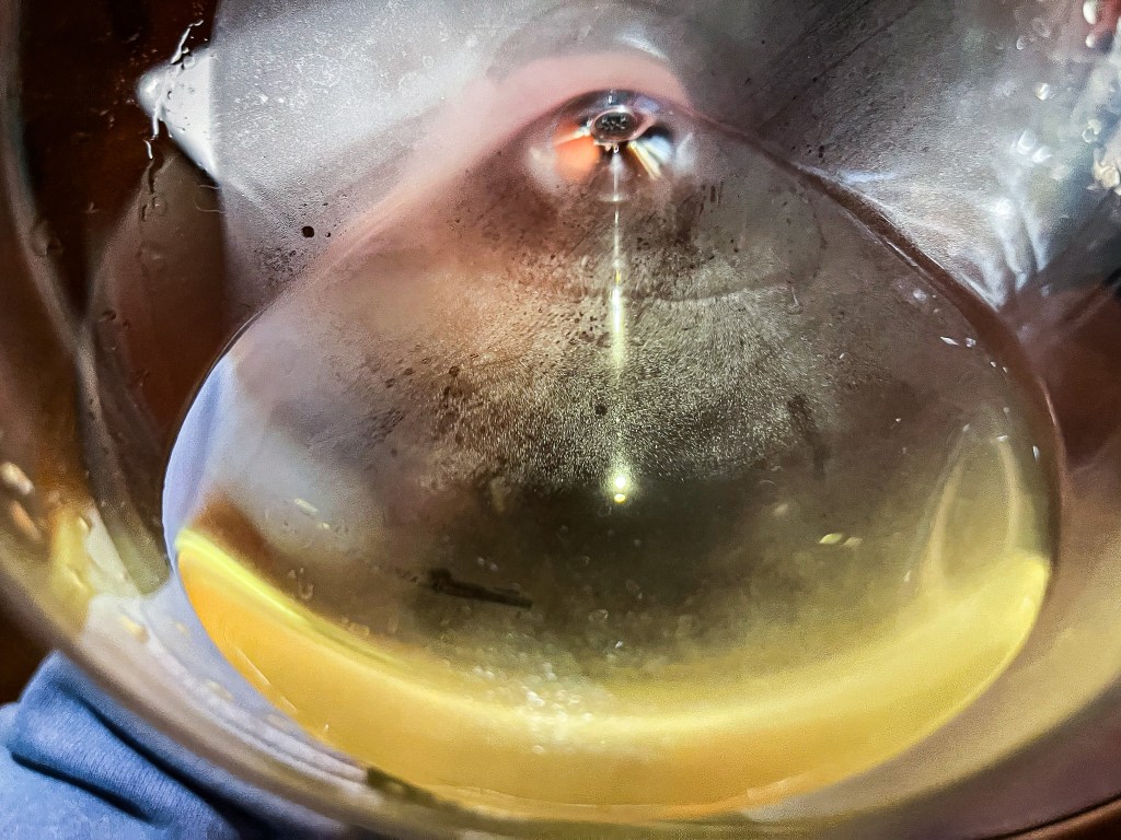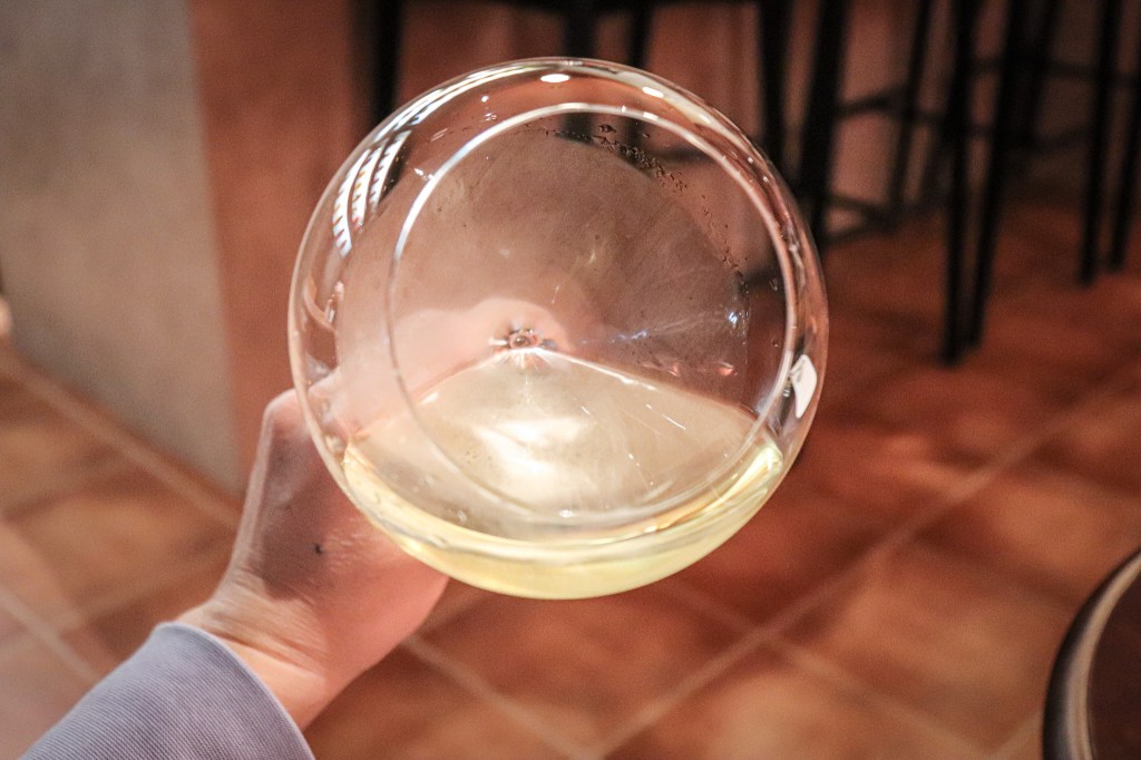 搖晃酒杯,傾斜而見酒腿俐落滑下,優雅而舒服,很清澈的葡萄酒。
