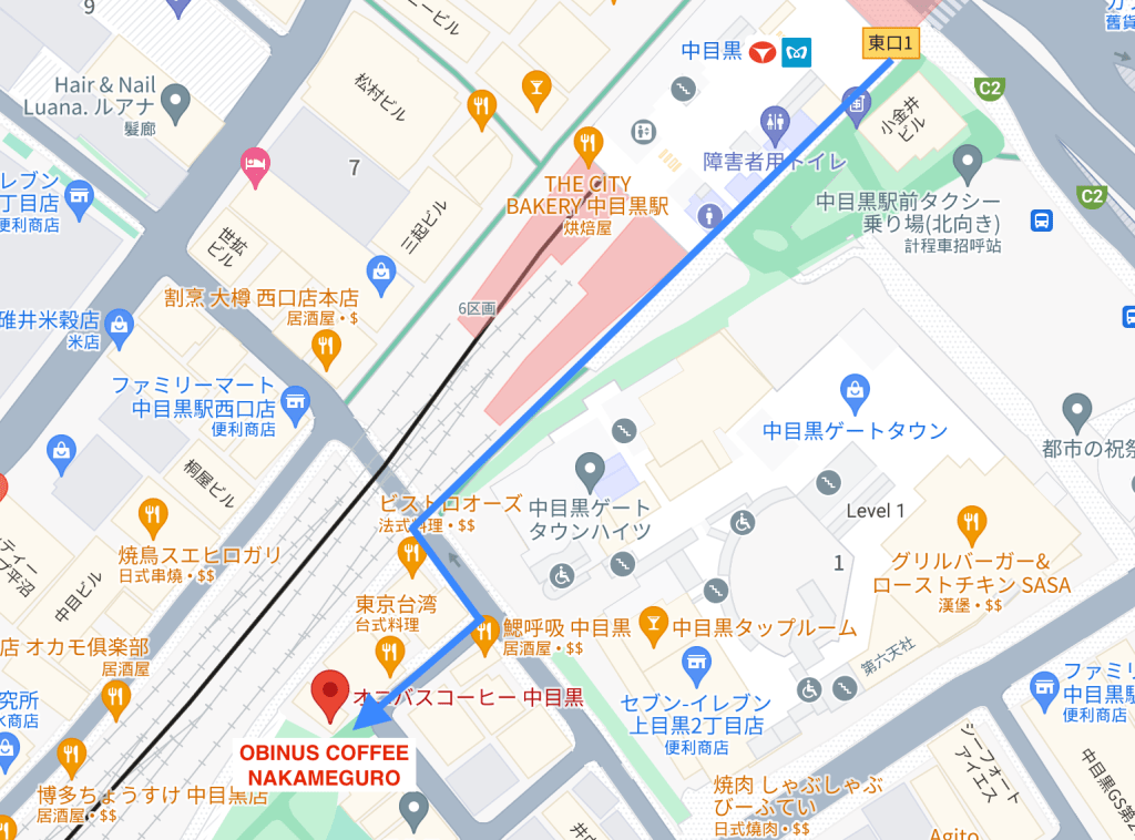 東京地下鐵東急電鐵東橫線目黑站(TY03, Naka-meguro)→OBINUS COFFEE NAKAMEGURO(35.38N, 139.41E)