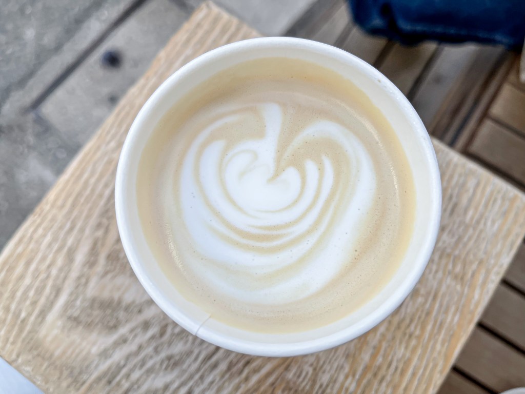 熱拿鐵,我仍然是喝拿鐵,也是一杯外帶的熱拿鐵,其實也就是多取了一個杯蓋吧。大開杯蓋。坐在旁的小花圃位置,透過陽光的照射,讓這杯拉花拿鐵格外有溫度。