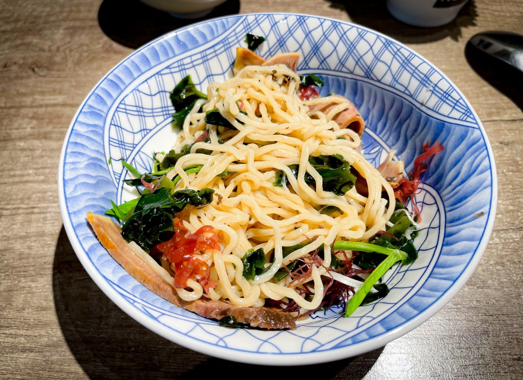 好吃最重要,再取一塊用來捲一些麵條下肚最過癮,不過要注意,有山葵藏在其中,嗆辛感重,一不小心就會感動到眼淚直流,而松露醬透過熱騰騰的麵蒸汽氣傳送鼻子裡,氣味真的很香,口慾就開…。