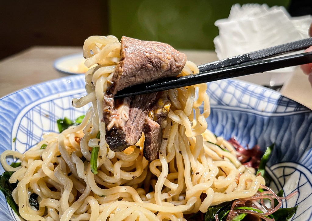吃下,我喜歡,因為有老牛肉麵館的老牛熱麵味,這就是我最愛的味道,這讓我想到北投的某間牛肉麵也有這樣的老牛肉麵味。麵條處理的也很精湛,Q彈有勁,這是認真負責的表現,我會這麼說,就是有很多牛肉麵館的麵條都很退步,好東西都被煮壞。將料與醬拌一拌,雖然很想加辣油,但是我知道現在身體狀況不適合便作罷。但這款麵,如果是我正常的狀況,可以連吃兩碗!!