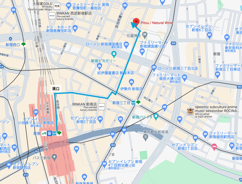 從山手線京橋站(JY29, Shimbashi)→山手線新宿站(JY17, Shinjuku)→BAR PITOU(35.41 N, 139.42E)。