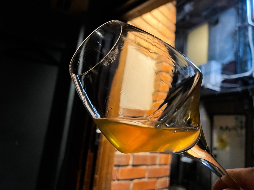 觀看酒緣,透澈銳利,儘管燈光昏暗,也表現出透明橘黃、如琥珀金如啤酒黃稻黃色。我搖晃酒杯,酒痕輕盈流落,酒面乾淨光澤。