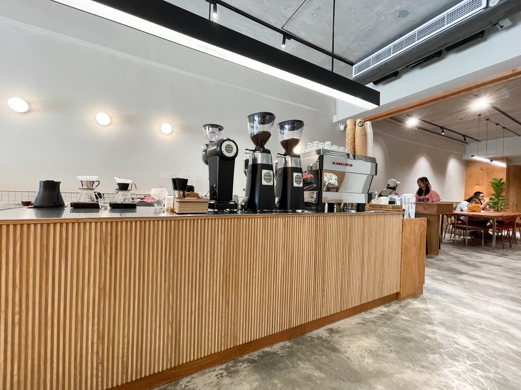 進到店裡,先選擇咖啡結帳再找位置,門市狹長型,裡面一張共享桌,一排靠牆的無桌座位,當然還有進門前所見的無障礙空間座位與室外位置,還有我今天所座的位置,吧台前方。好的,選擇咖啡拿鐵吧。