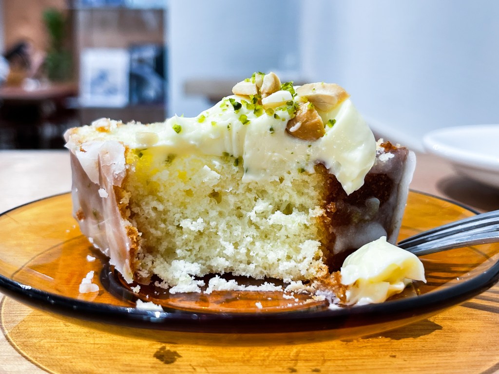 其實我很容易接受推薦的,只要稍微停頓就是代表我心動搖。所以接受店員推薦,今天的拿鐵就來個單品豆吧。此外,也要來份點心,這裡的點心簡單就是只有司康與磅蛋糕,好的就這樣的熱度當然想要來一些酸度,於是也點了一份檸檬磅蛋糕。
