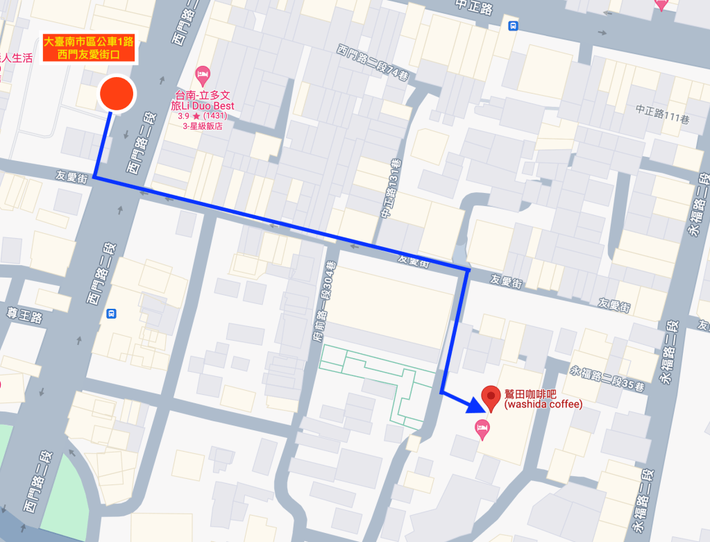 從臺南火車站(23.00N, 120.21E)轉搭市區公車1路公車臺南火車站→市區公車1路公車西門友愛街口站→WASHIDA COFFEE(22.59N, 120.11E)。