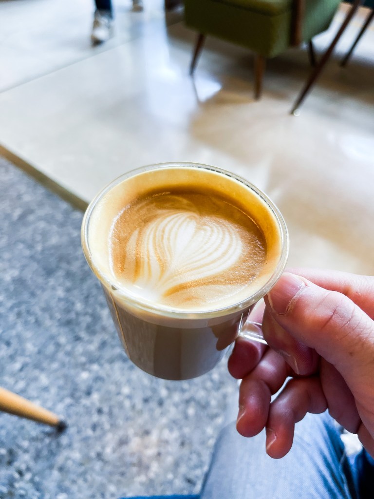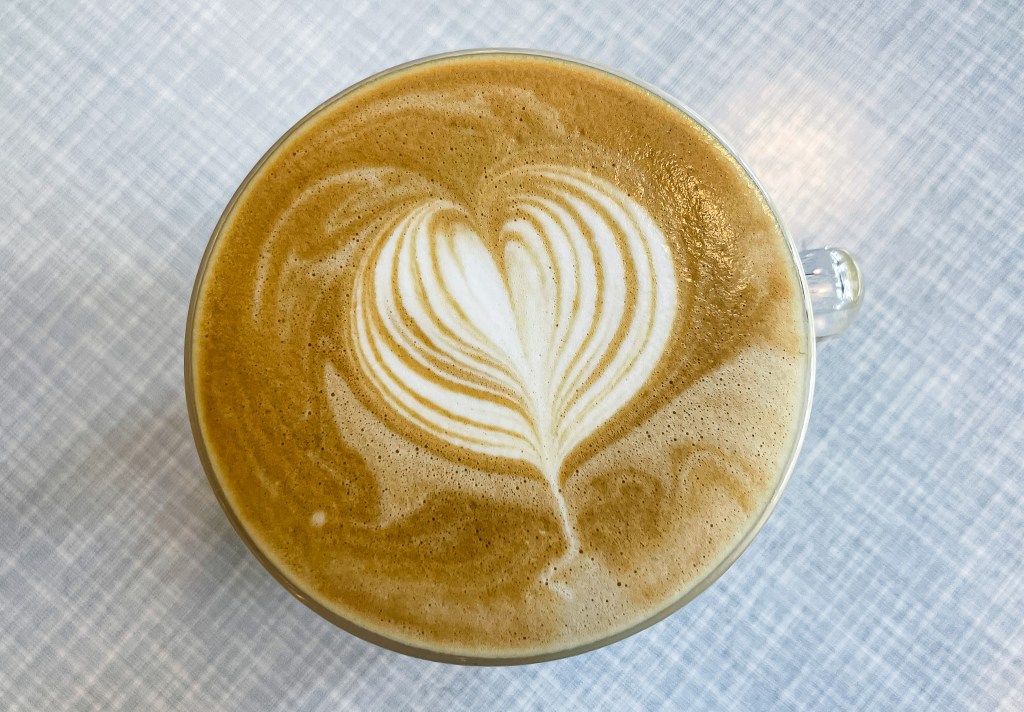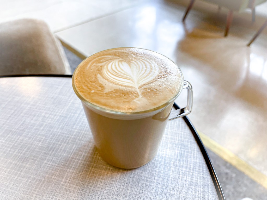 牛奶糖色系無誤,在透明的、潔淨細緻的手把杯中呈現的優然自在的咖啡風格。心型拉花、泡沫細緻,側面從透明的杯子角度,劃出層次。