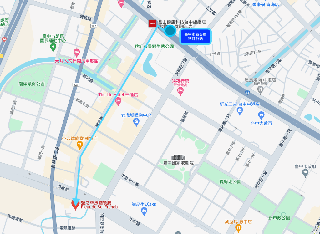 從臺中車站→轉客運公車(行經臺灣大道)→秋紅谷站→鹽之華FLEUR DE SEL(24.09N, 120.38E)。