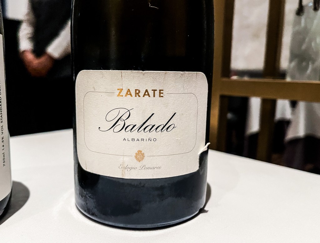 而今天的白葡萄酒是Zarate 100%Albariño葡萄品種,來自於El Pago El Balado葡萄園。這裡屬於Sisán區的Albariño品種葡萄藤種植地,在1950年時,這座葡萄園原來是種植其他水果的地方。「Balo」在加利西亞語中是牆的意思,相當於“clos”,地塊被花崗岩牆包圍。而El Balado地塊朝南,而土層淺,屬花崗岩當時十分貧乏。