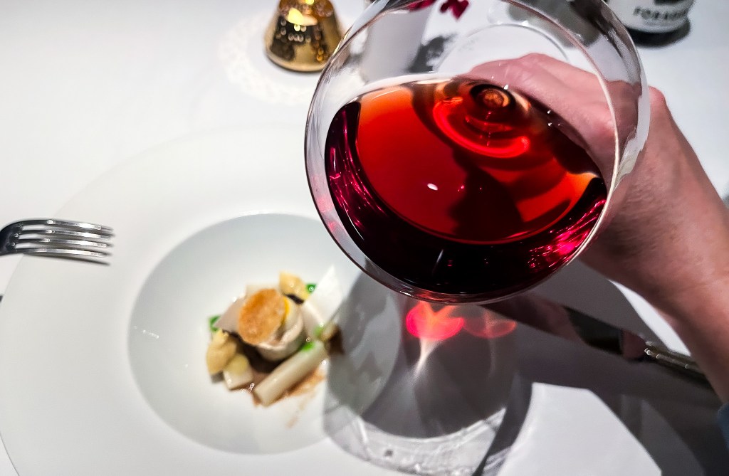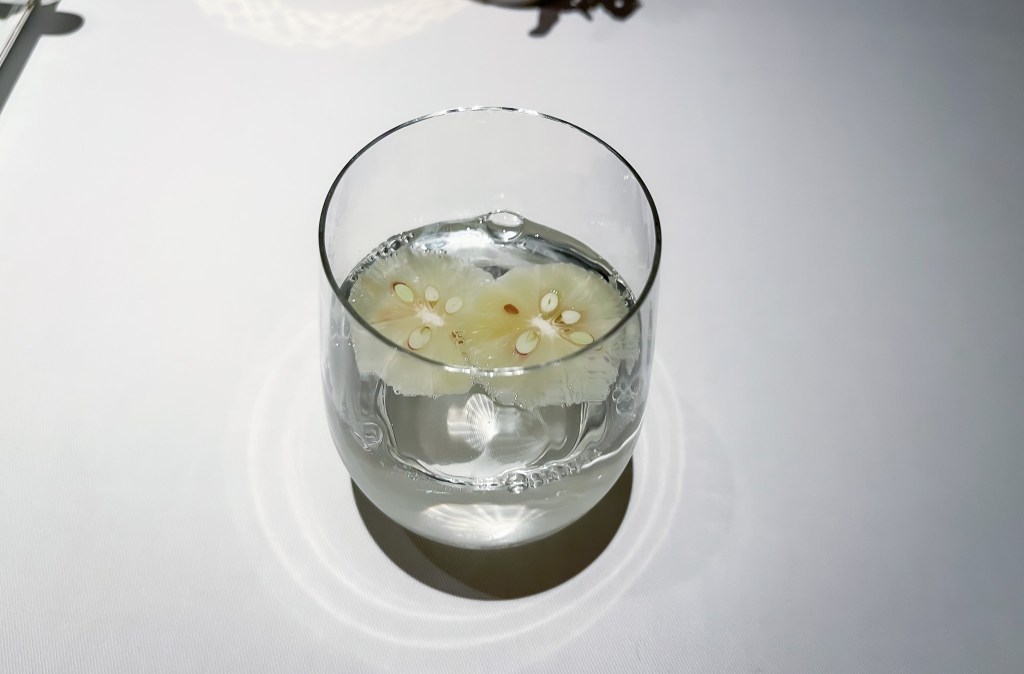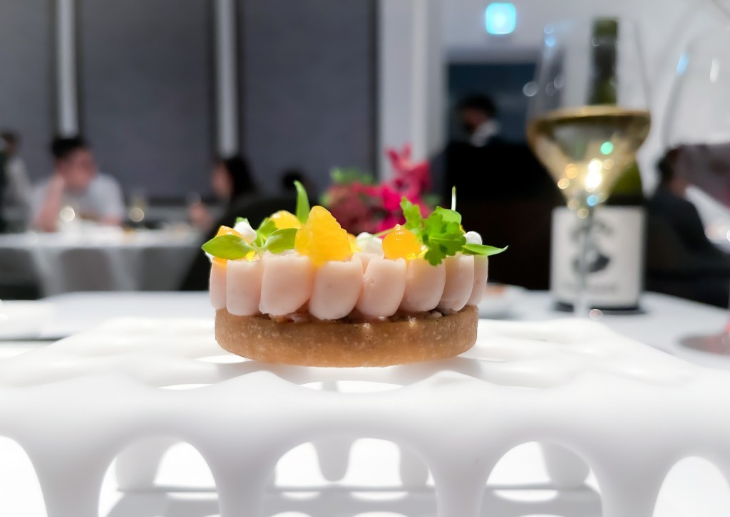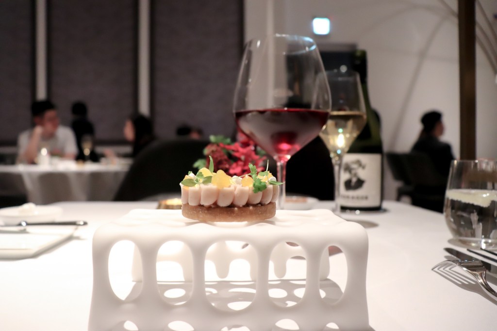 嗯嗯…這太爽口了,一股輕盈清香的百香果酸爽度,尤其有點柳橙感和百香果的分子球,隨之而來的酸爽開胃的百香果肉汁等水果感風味,十分開胃舒服,對了還有點微微稠感,這真的開胃。搭配白葡萄酒,也許是酸度均衡了酸感,呈現一種橡木桶與奶油味,雖然輕微但也很美妙。