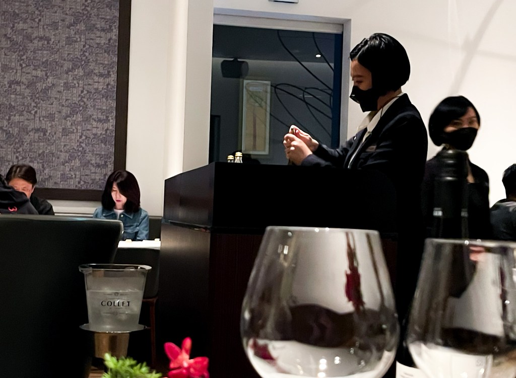 侍酒師完成開酒後,將酒注入酒杯之中,接著放入冰桶內,在優雅的酒杯裡將葡萄酒的細緻徹底呈現,此時我已經忍不住想要一親芳澤了!!好的,現在就進行品酒吧。