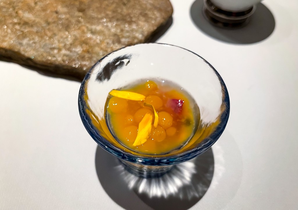 春天的木瓜紅魽海膽表現了這道料理的滋味,這道太讚了,明明是紅魽為何滋味像是鮪魚中腹,尤其有油脂感,其嫩稠然後那種不是咸澀的魚鮮味,搭配嫩鮮滋味順口的海膽以及內藏的辣椒帶出的微辣感,這道很豐富有層次重點好吃。