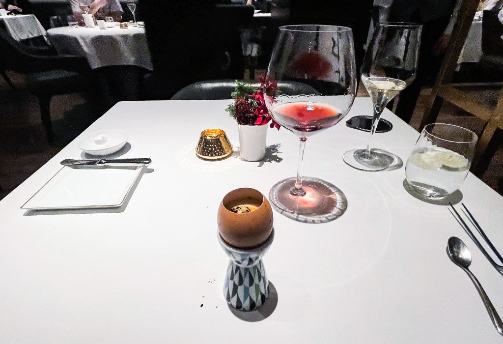 春天菜單的第二道是一道趣味小食,服務人員送上了一顆紅玉蛋殼,但內容物實在巧妙有趣。