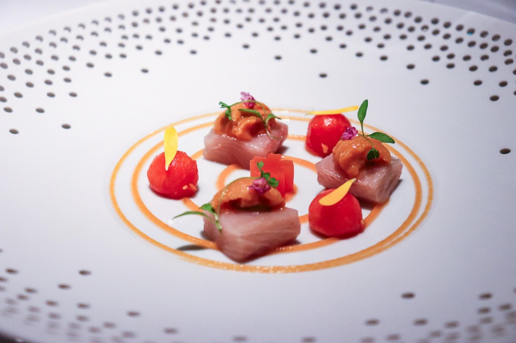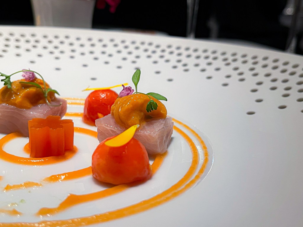 今天的第三道是沙拉Salad,而我選擇「生魚木瓜、海膽、紫蘇葉、醃辣椒」(Fish sashimi -Papaya, Sea Urchin, Perilla leaf, Pickle chili)。